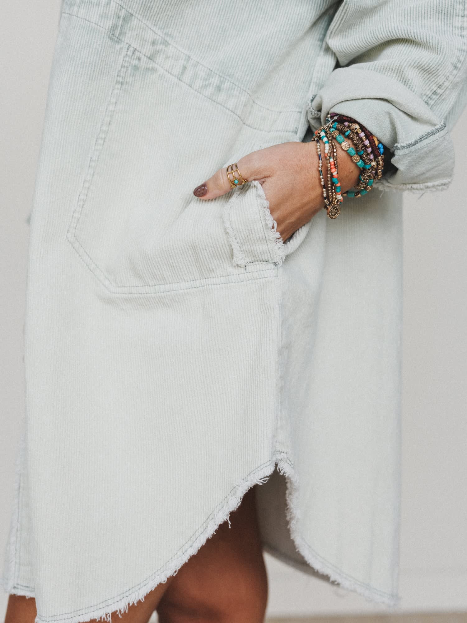 - All You Do Tie Dye Corduroy Tunic Dress: A soft, washed light-blue corduroy shirt dress with subtle tie-dye texture, raw edges, and oversized pockets—wear it as a dress, tunic, or open as a layer.