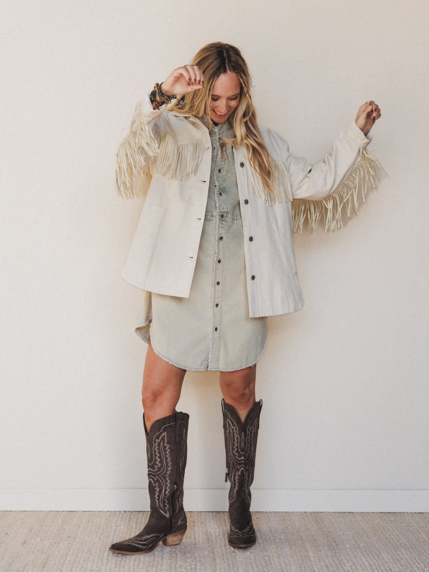 - Jackson Hole Button Down Jacket: Iconic western vibes meet everyday ease in this creamy canvas jacket, complete with allover fringe that sways with every step.