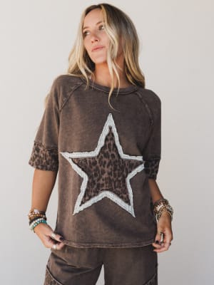 - Cosmic Drift Patchwork Top – A relaxed-fit mineral-wash tee with a leopard star front and lace trim—unexpected and undeniably fun.
