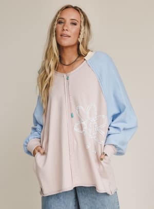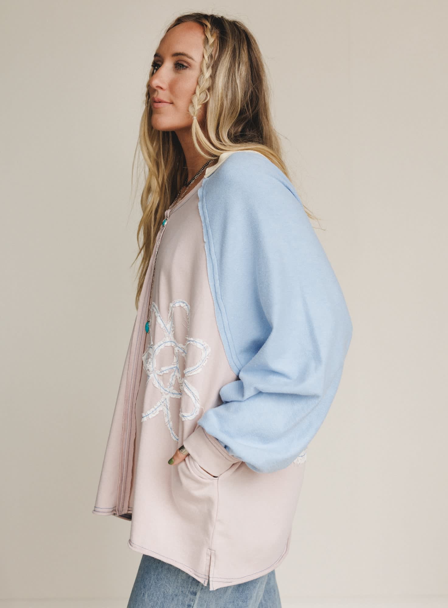 For the dreamers and peace-lovers, the Cotton Sky Flower Patch Top is like a wearable exhale—soft, serene, and sprinkled with good vibes. With its pastel tones and signature flower peace sign, this top brings major throwback energy with a modern twist.