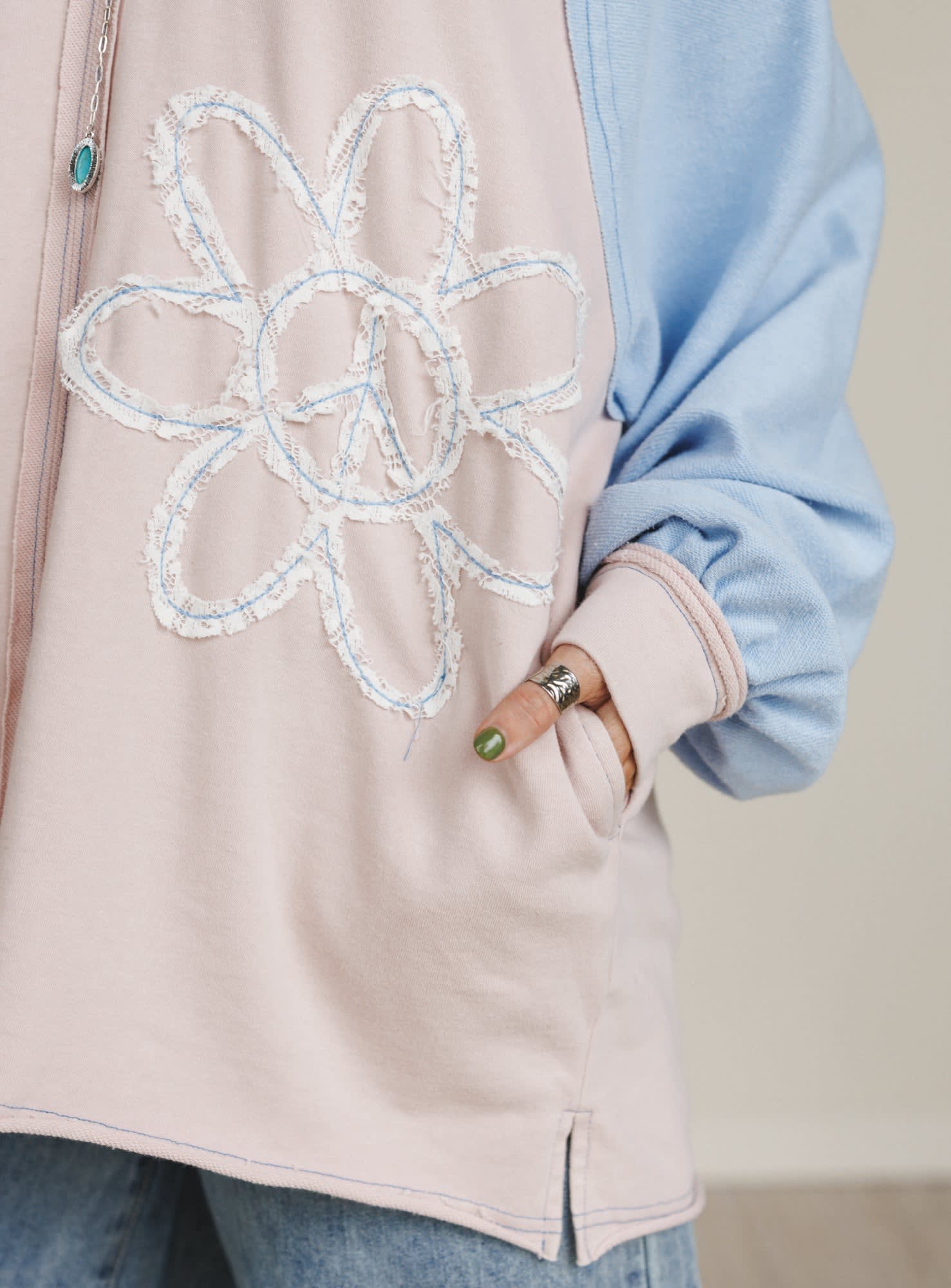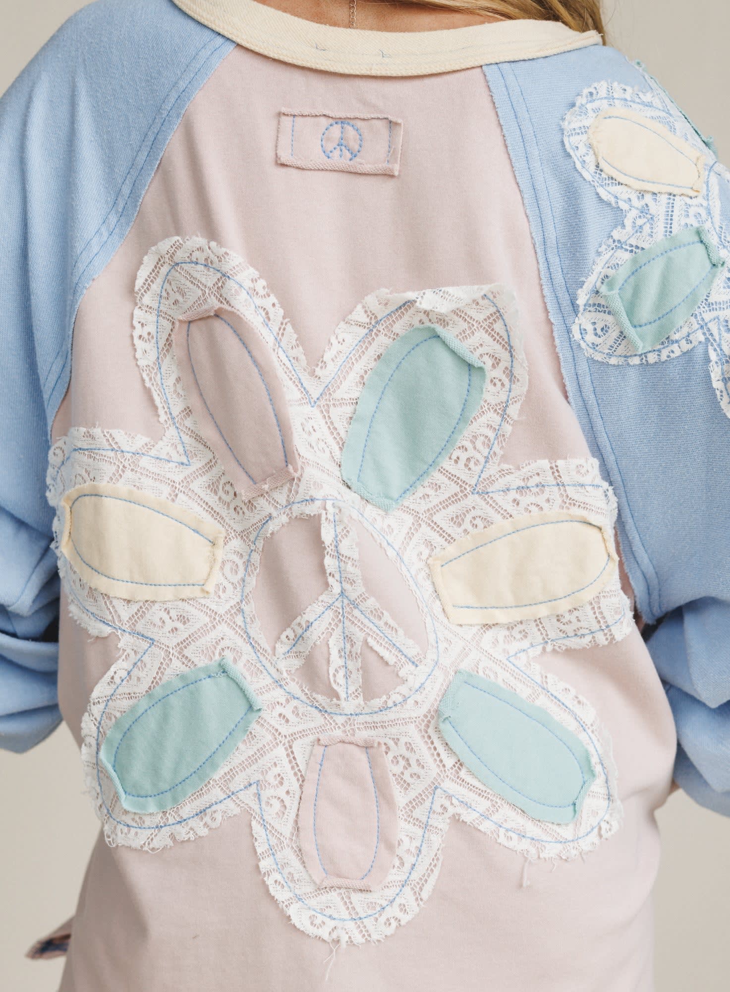 • Oversized floral appliqué made of lace and pastel patchwork with peace sign detail