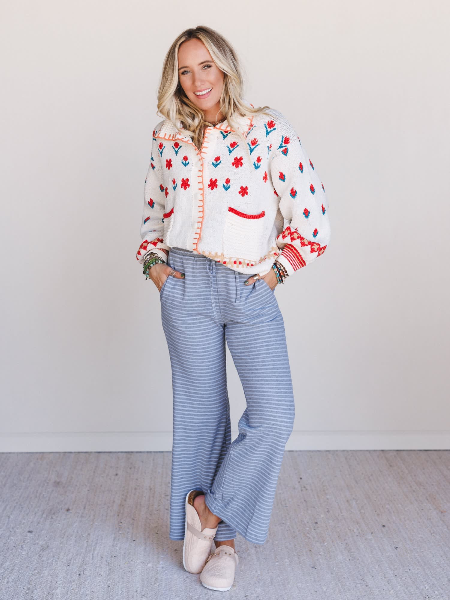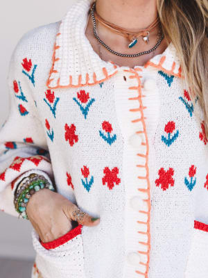 - Creamy knit base with sweet heart-and-tulip floral embroidery