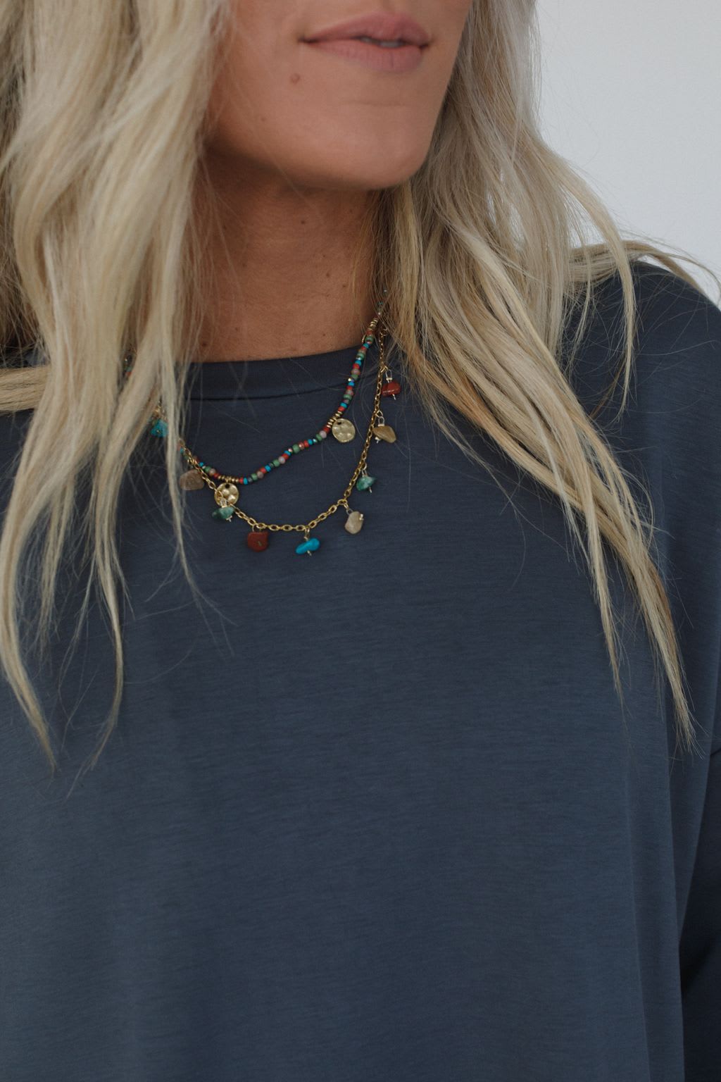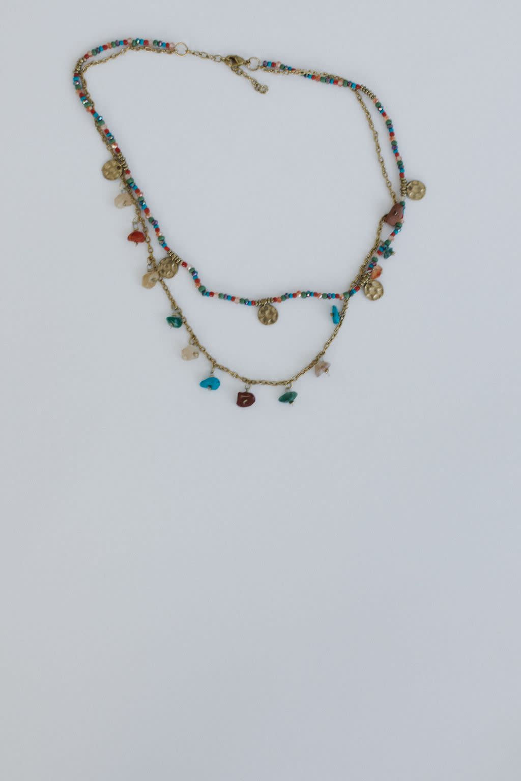 - Second layer has gold chain with so cute stone bead charms