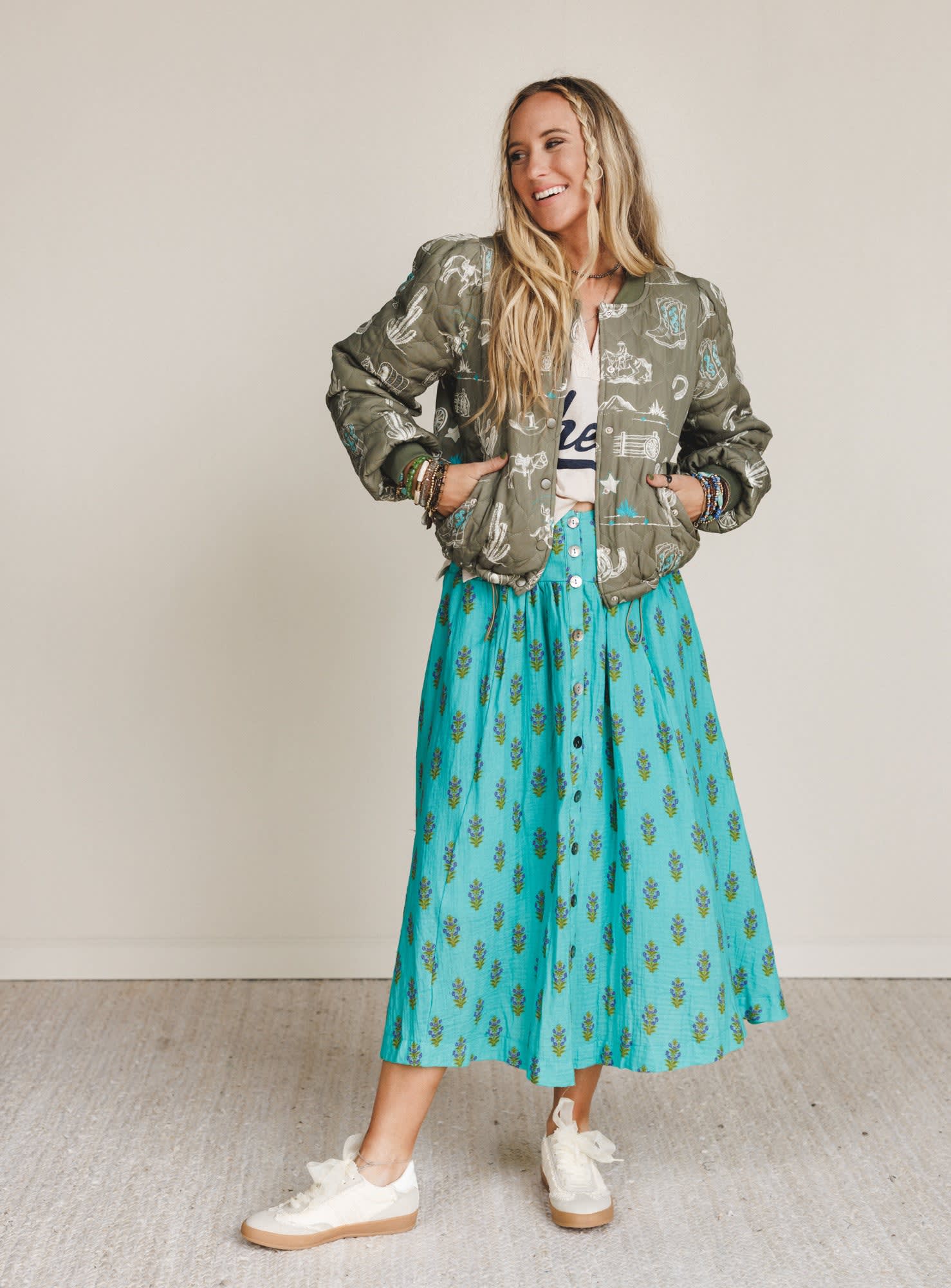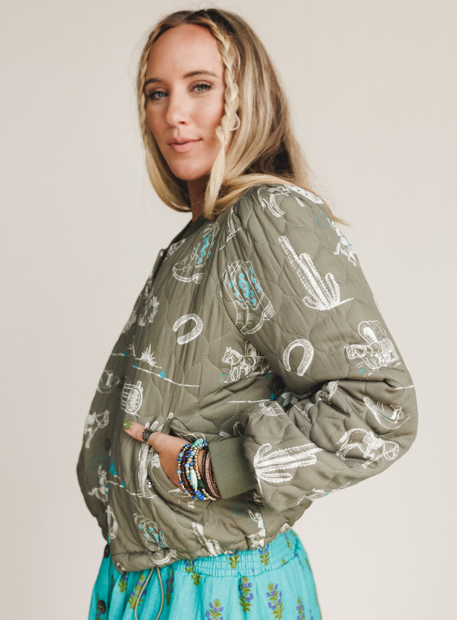 Western spirit meets cozy layering in the Cowgirl Code Jacket—your new favorite piece for adding a touch of rugged charm to any outfit. With a quilted texture and playful cowboy-inspired print, this one’s got personality in spades.