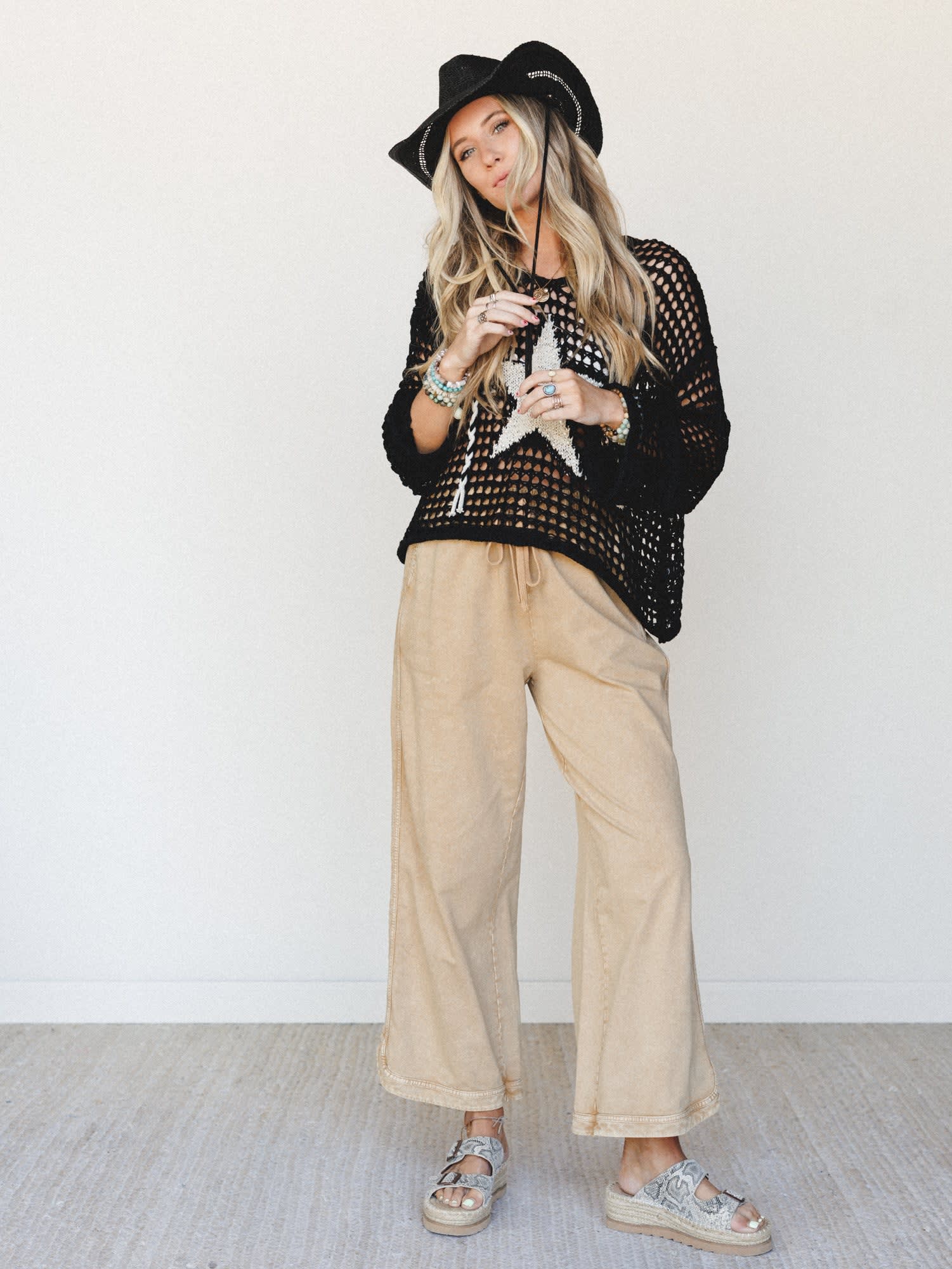 • Wide leg cropped pants offer a comfortable drawstring waist and flowy silhouette perfect for festival season styling.
