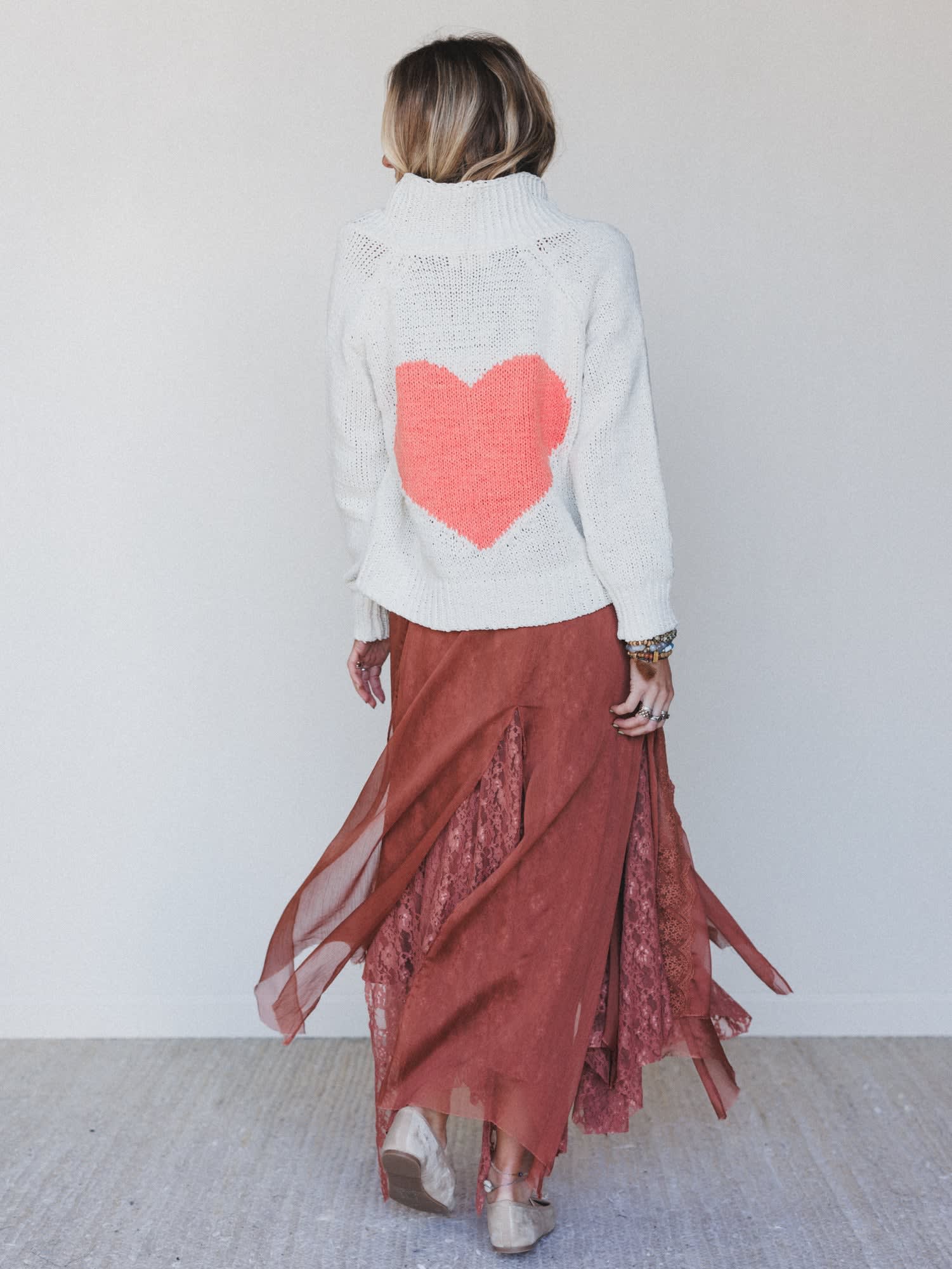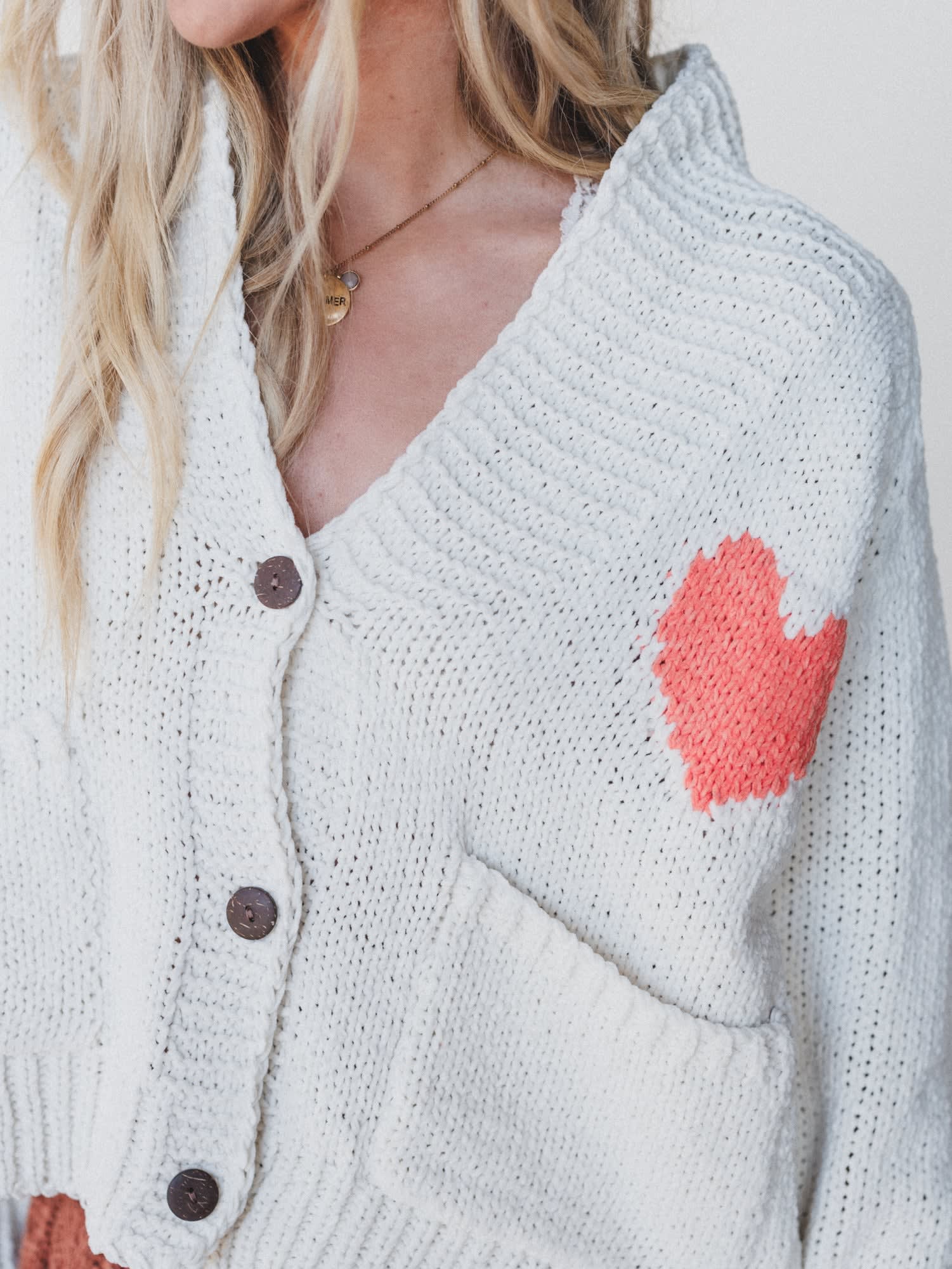 Fall in love with comfort and charm. The Cozy Beat Sweater wraps you in warmth with its chunky knit design and oversized pink heart graphic—front and back—for a playful pop of love. Designed with an easy, relaxed fit, this cardi-style sweater is both snuggly and statement-making.