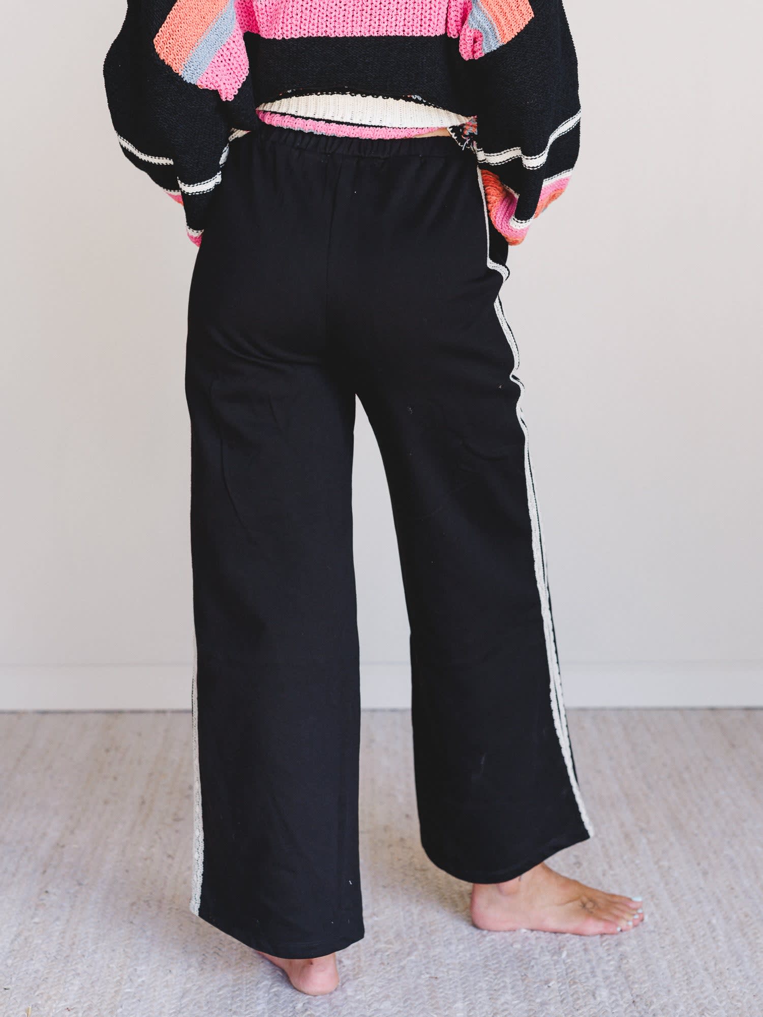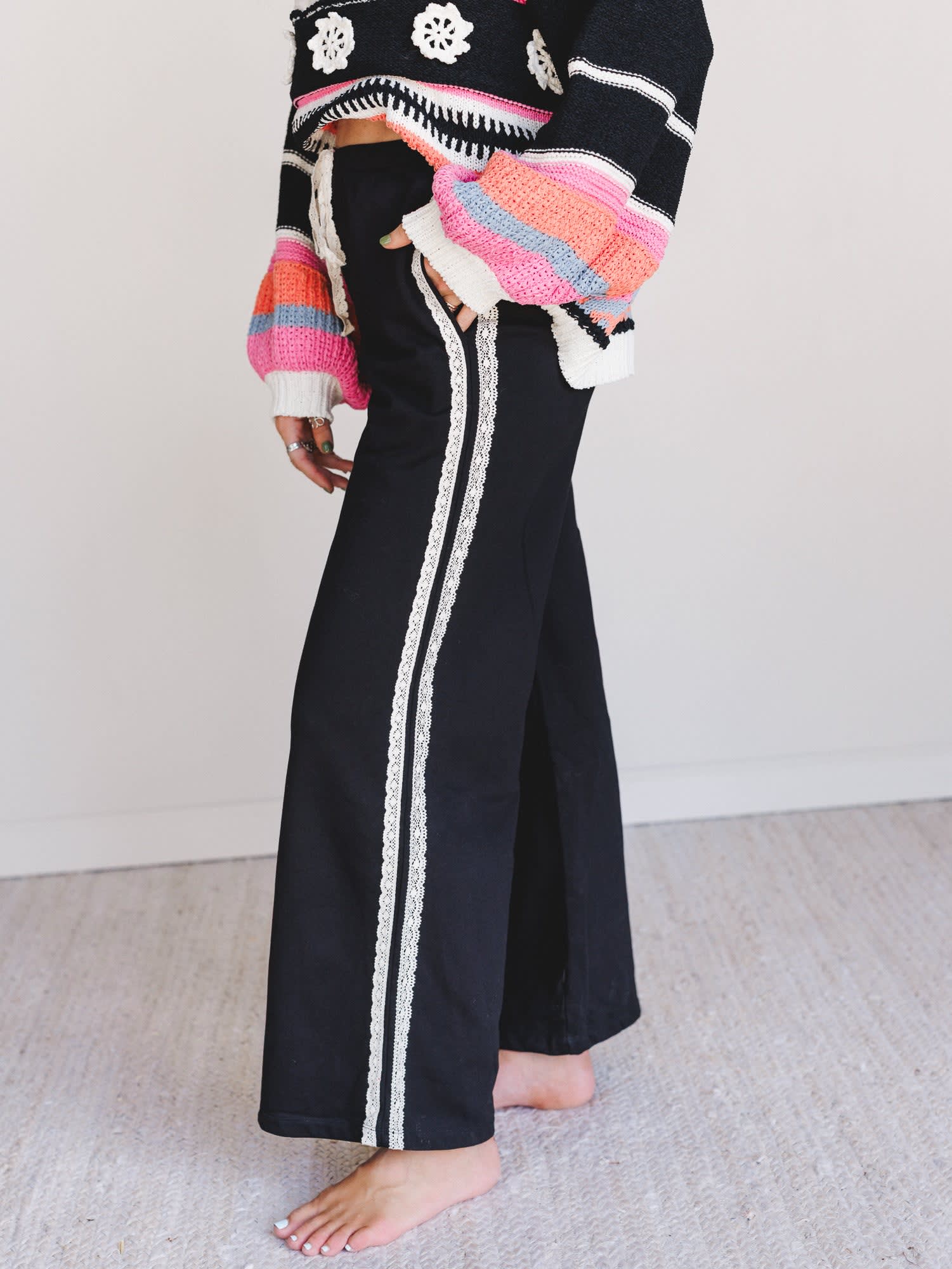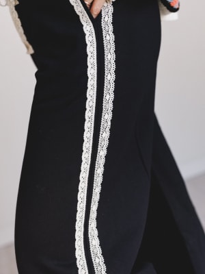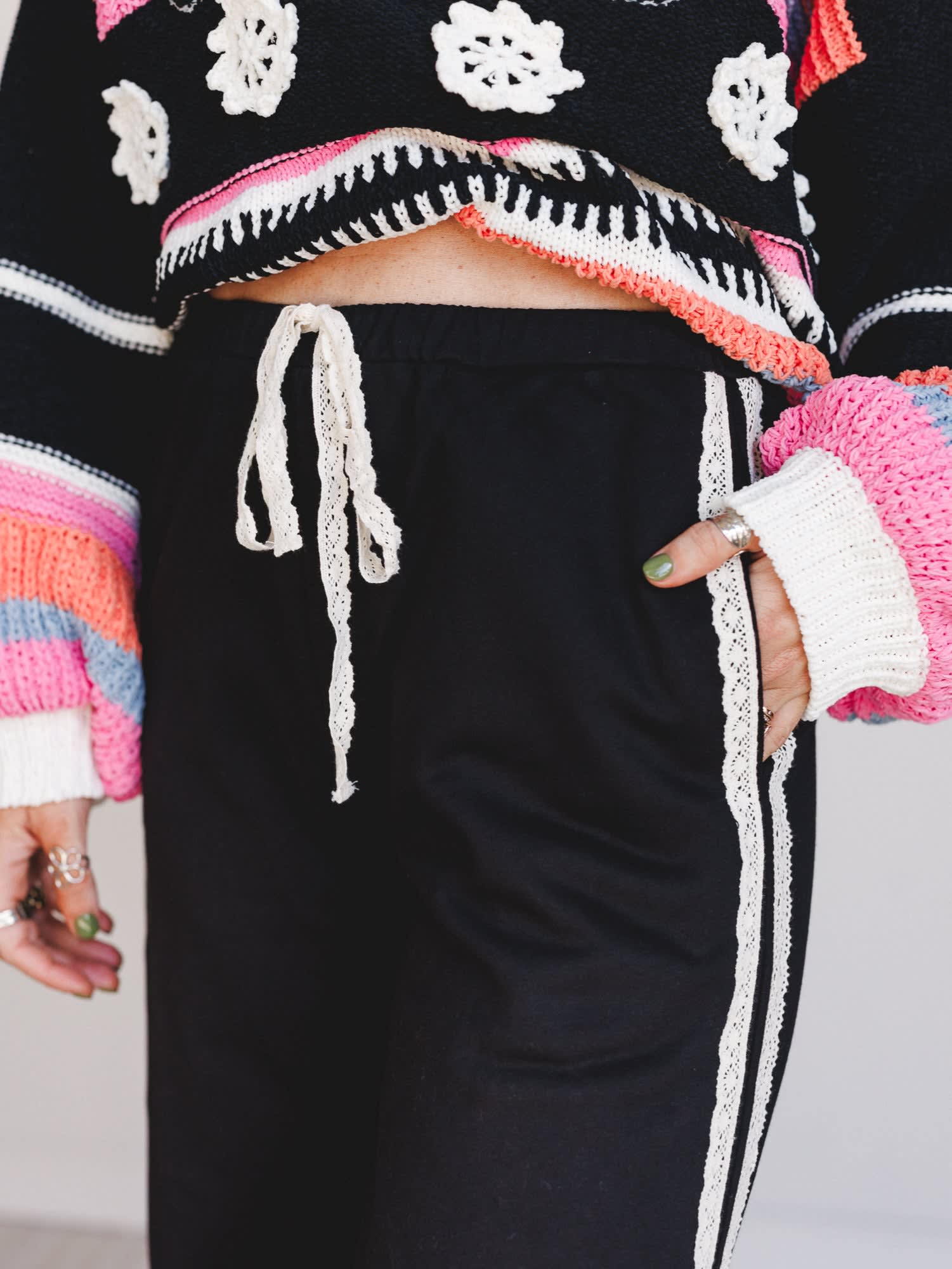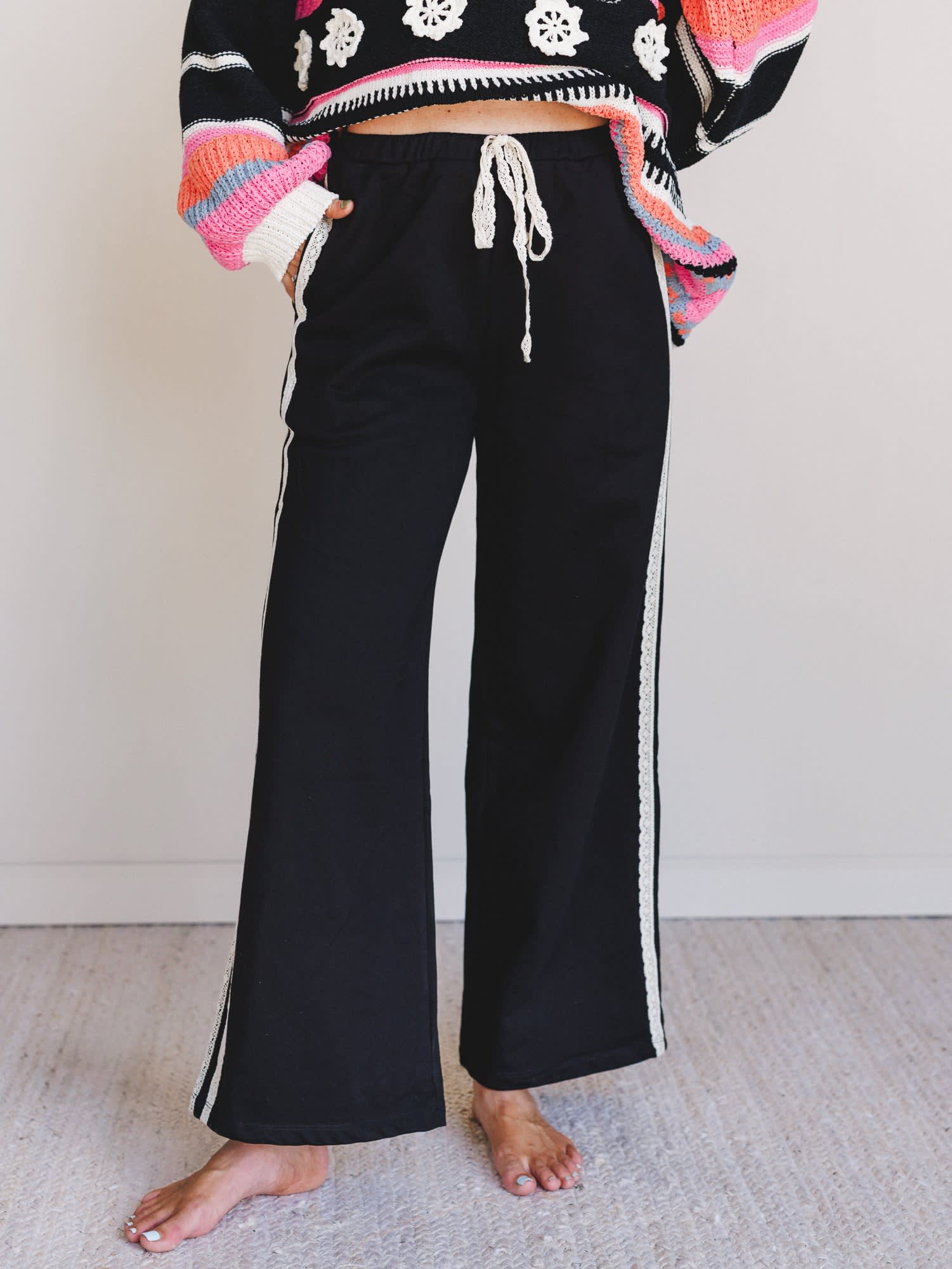 - Black wide-leg lounge pants with contrast lace trim and a drawstring waist—equal parts cute and comfy