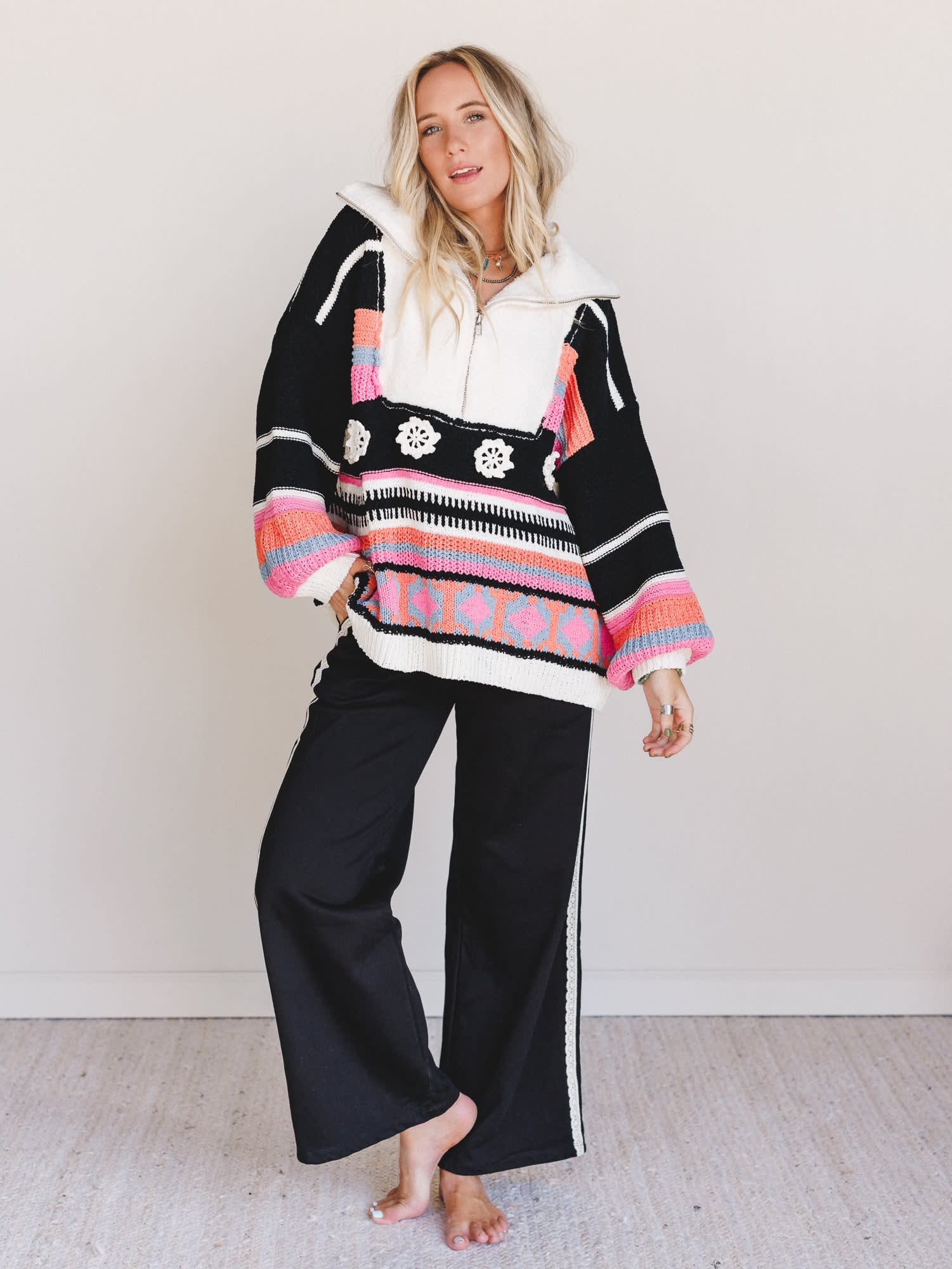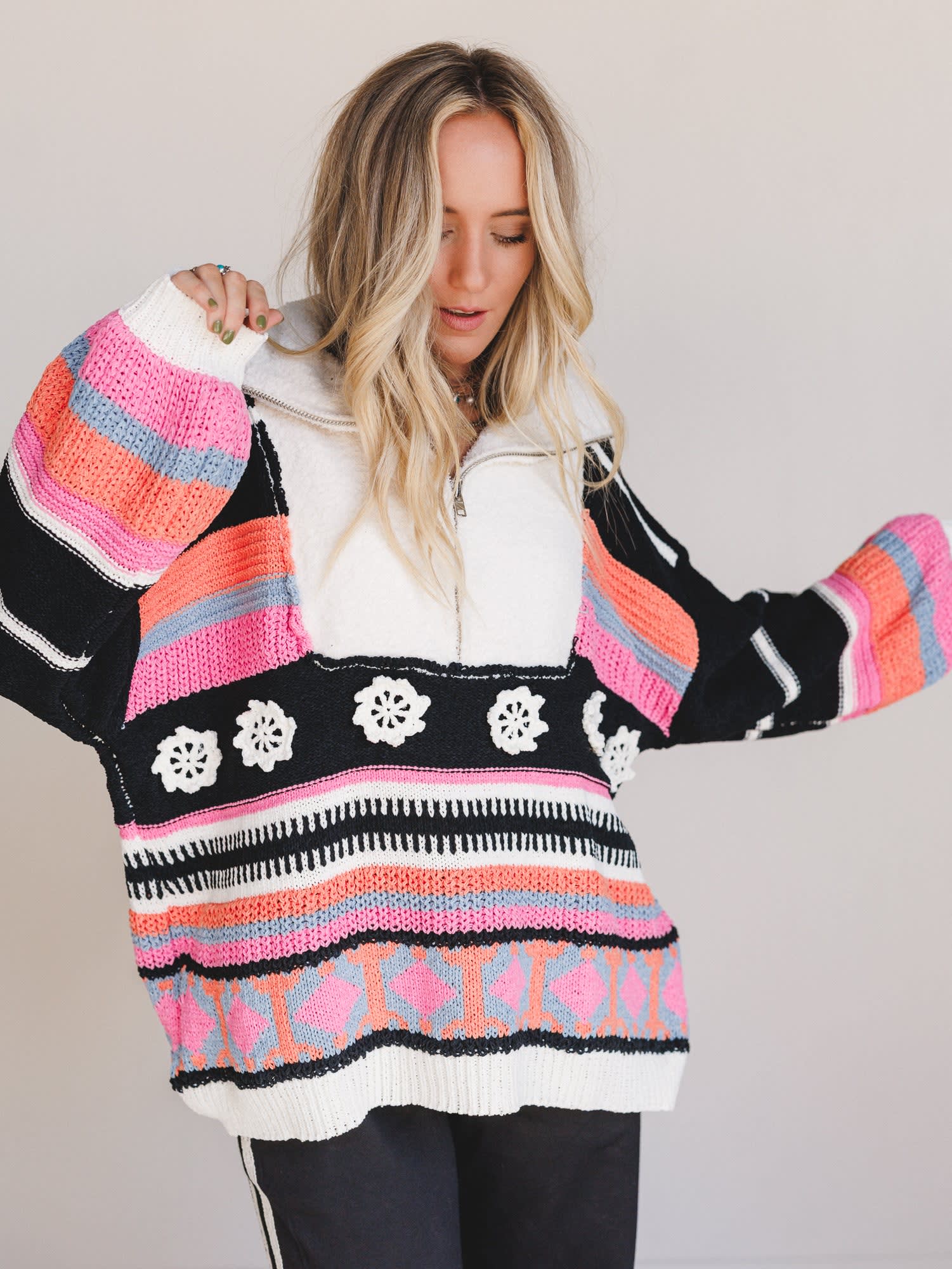 - Statement pullover with mixed crochet patterns, bold colors, and a half-zip collar for an artsy, bohemian edge
