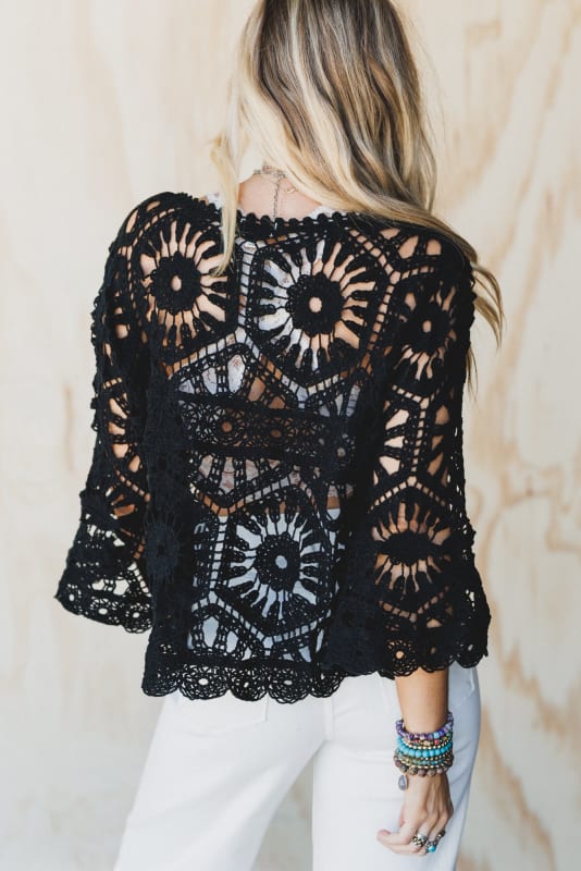 This lace crochet top pairs perfectly with bell bottom jeans for a 70s-inspired retro look.