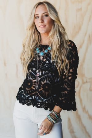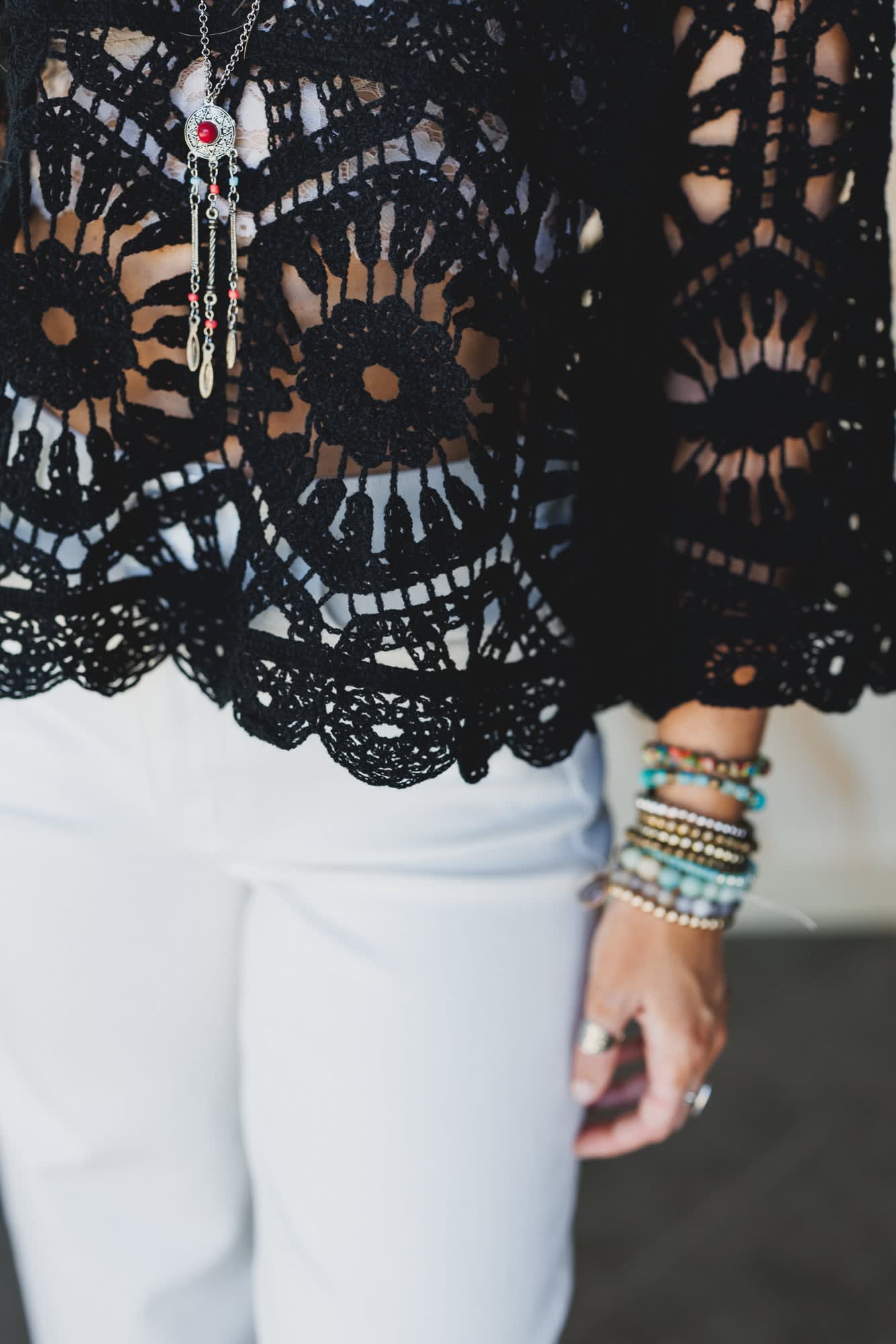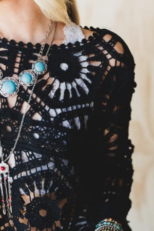 This lace crochet top pairs perfectly with bell bottom jeans for a 70s-inspired retro look.