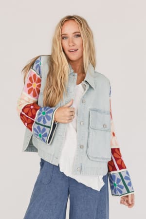 So unique, The Dahlia Sweater Denim Jacket is a boho jacket you can't miss out on!