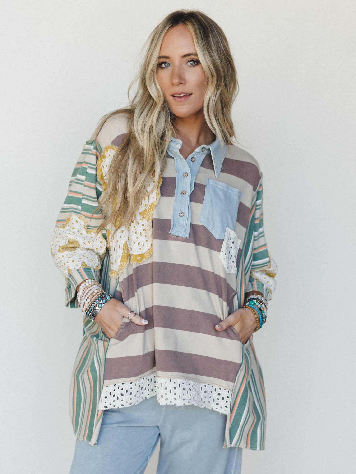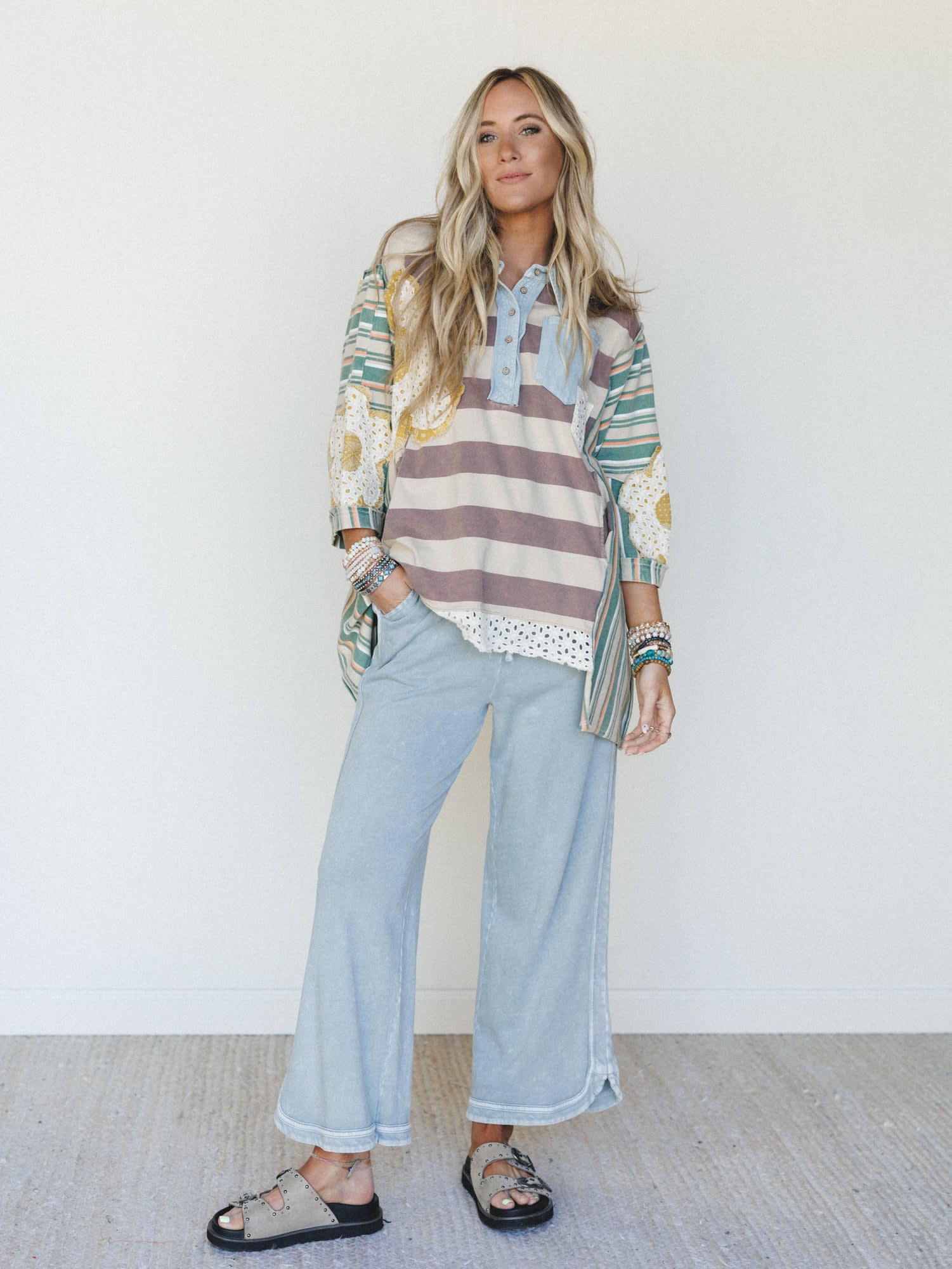 Meet the updated favorite you loved before—perfect for those days when you want something unique but still easy to wear. This standout piece blends playful patchwork with soft muted sage, lavender, cream, and denim blue tones for that effortlessly cool boho style.