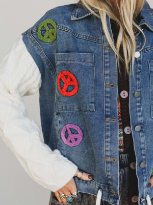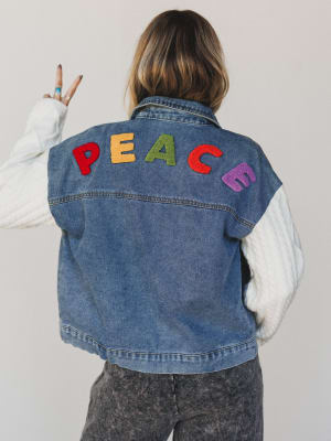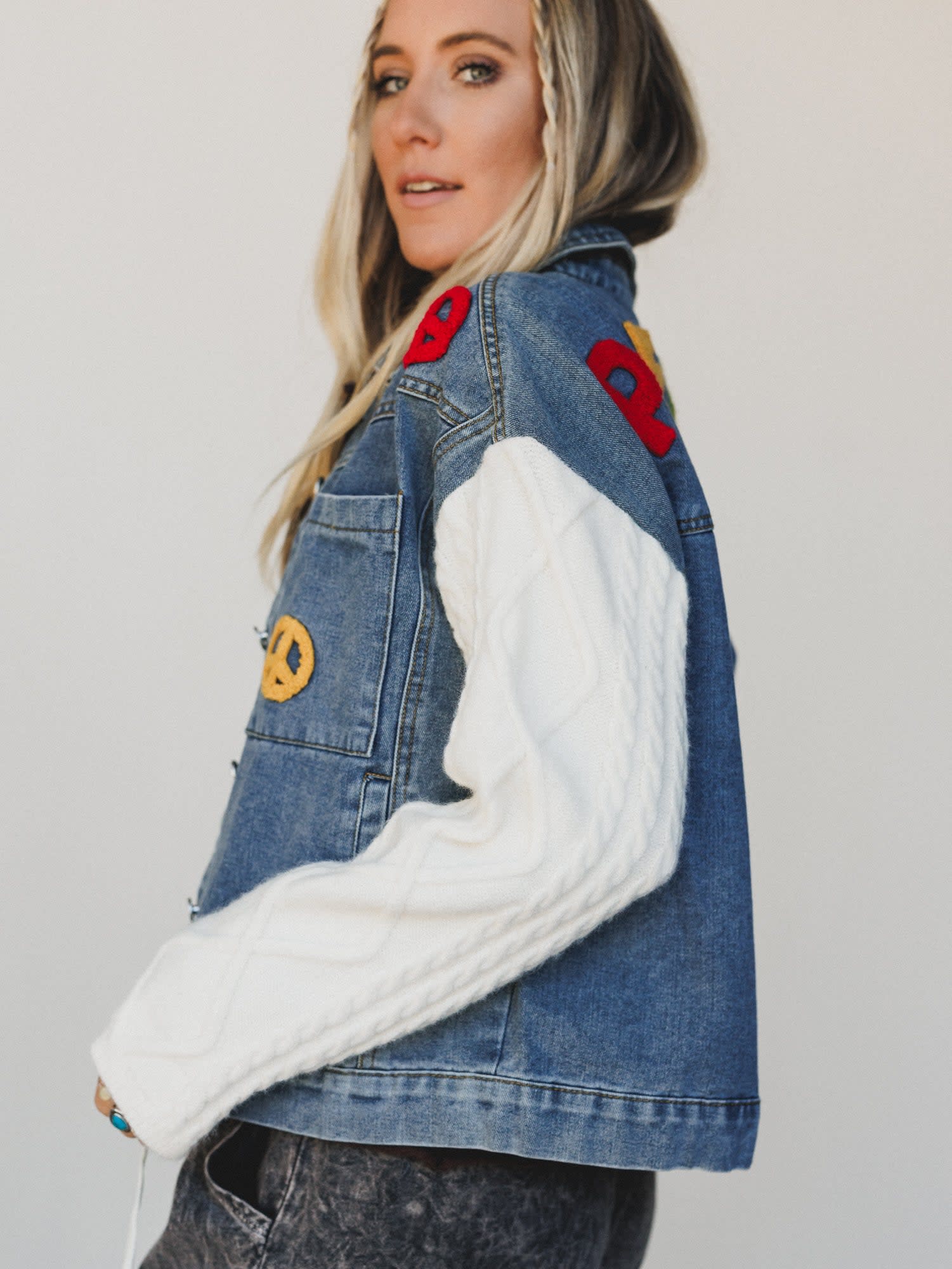 Let your vibe do the talking with the Daisy Signal Jacket—a playful remix of retro peace & love energy and cozy-chic layers. With bold chenille peace signs, cable-knit sleeves, and a big, bright "PEACE" shoutout on the back, this denim-meets-knit mashup is the ultimate conversation starter.