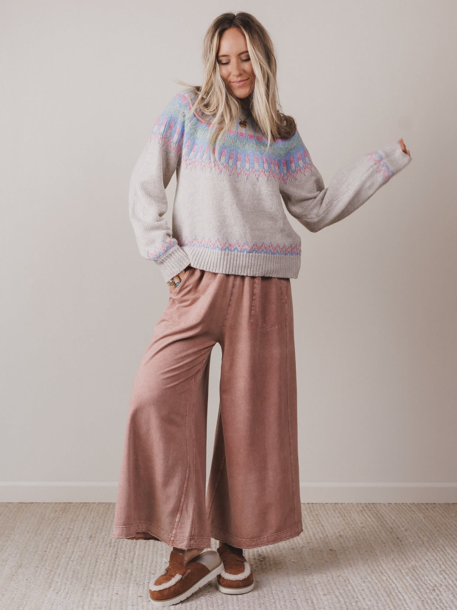Wrap yourself in soft, storybook charm with the Daisywood Sweater — a cozy knit that feels like a cabin getaway and looks like a pastel daydream. With its fair isle-inspired pattern and relaxed silhouette, this sweater brings a sweet vintage vibe to your cool-weather rotation.