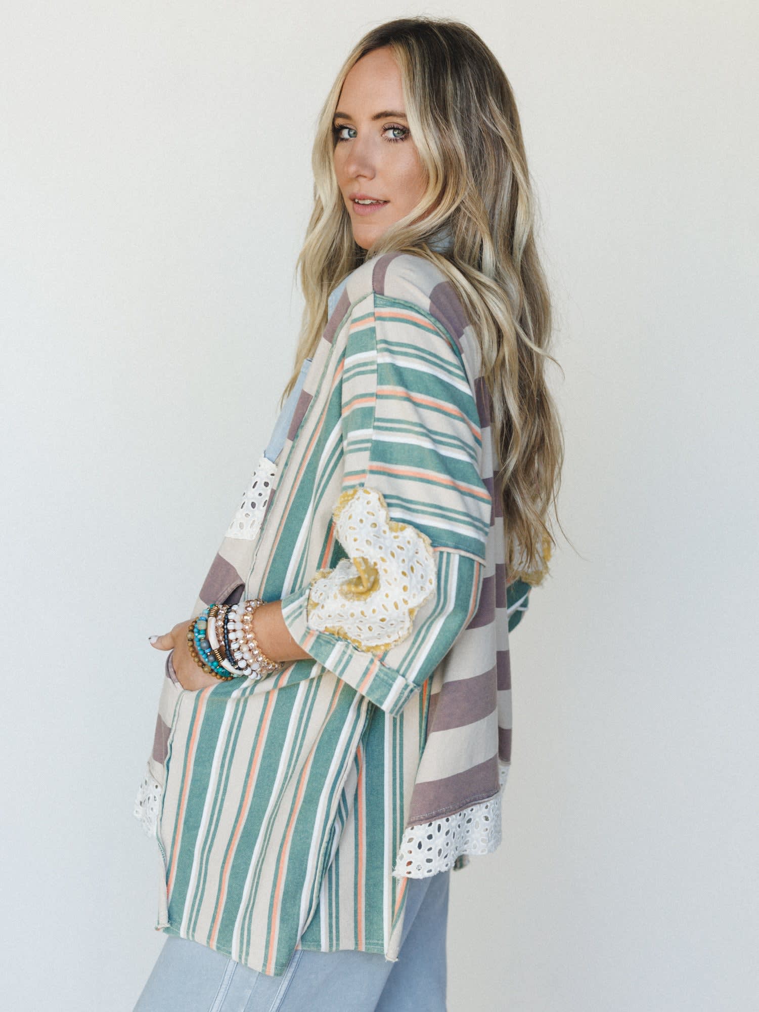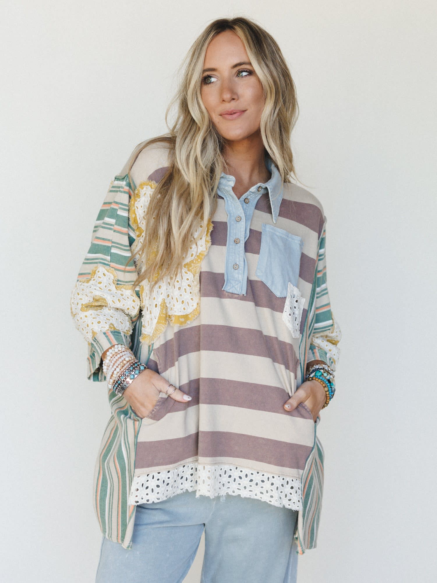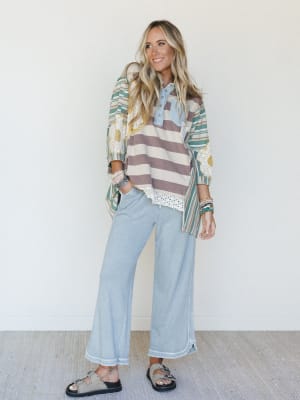 - The Daisy Darling Collared Top features a relaxed fit with mixed stripe patterns, lace patchwork, and a soft multi color palette for that standout boho top look.