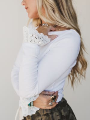 If you’re wondering what to wear with jeans for an easy everyday outfit or need a cute layering piece for cooler mornings, this romantic long sleeve tee is the answer. Soft, simple, and finished with the sweetest details, it’s a boho basic you’ll reach for on repeat.
