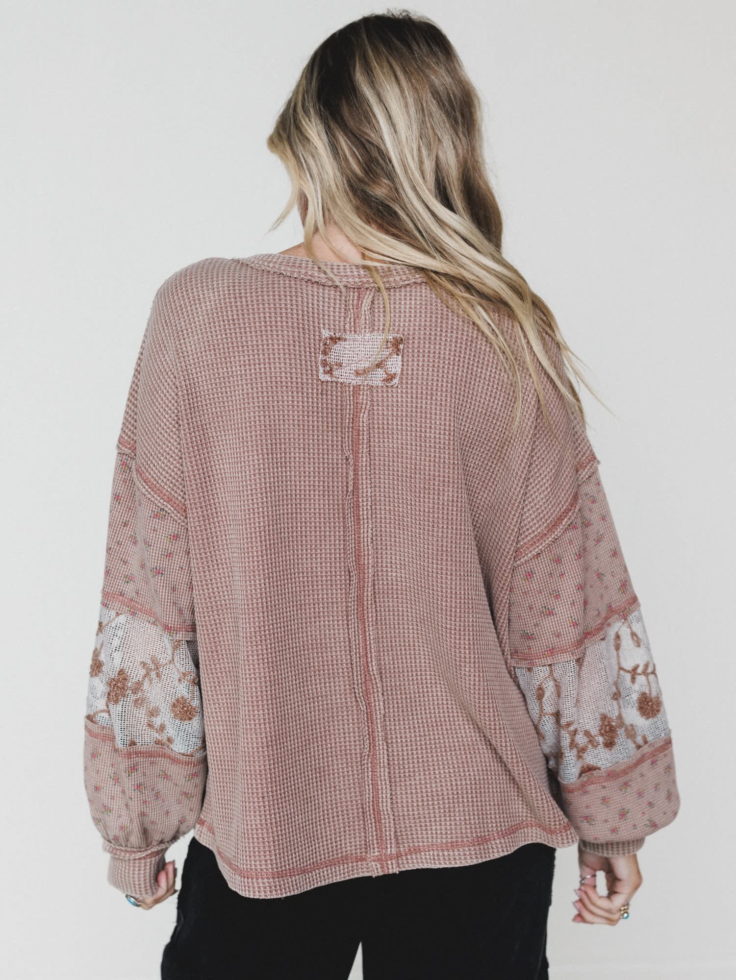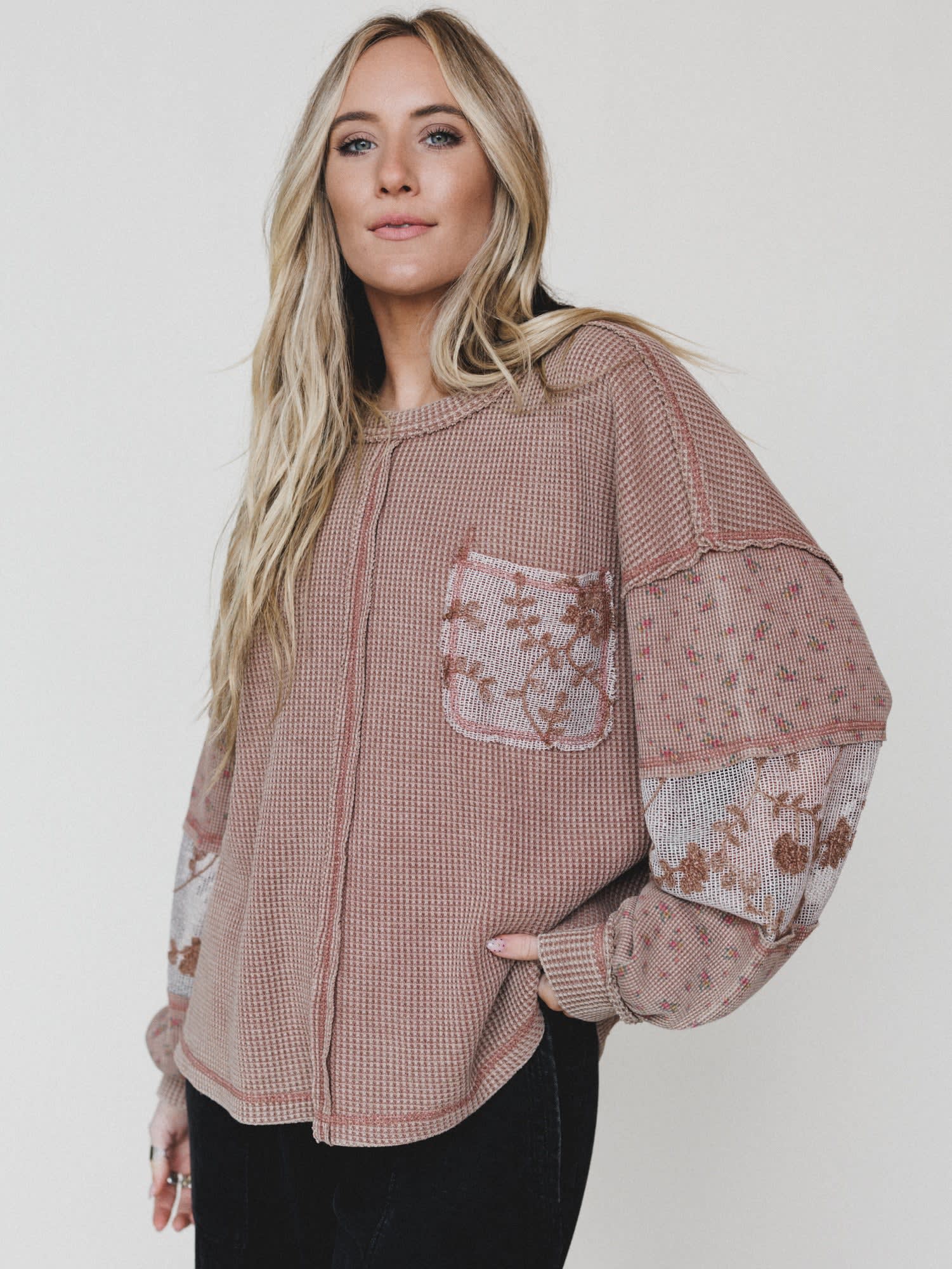 Soft texture meets sweet detail in this effortlessly charming everyday top. With its mix of waffle knit and delicate floral accents, it’s the perfect blend of comfy and feminine.