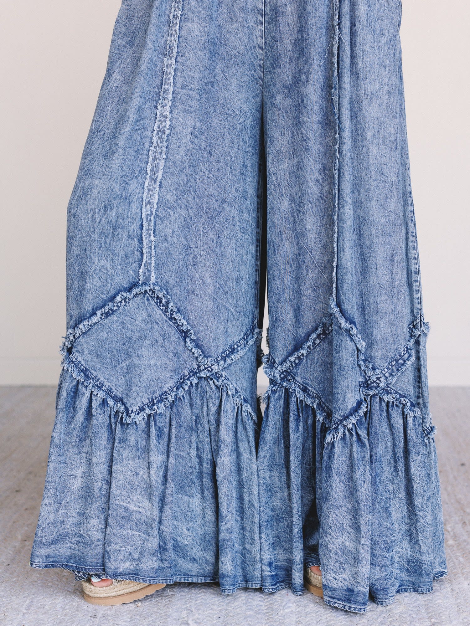 • Ultra wide-leg silhouette with raw seam details