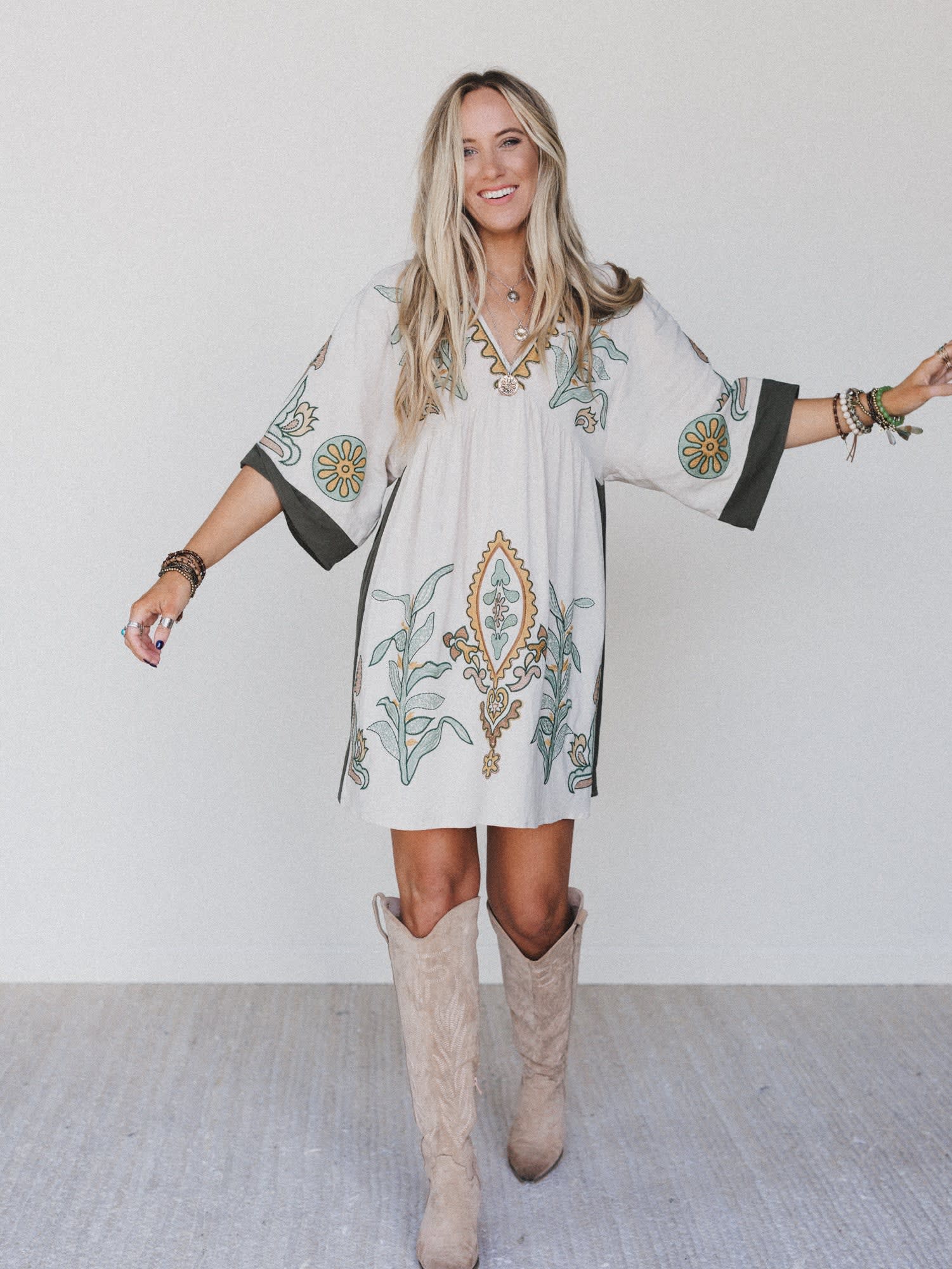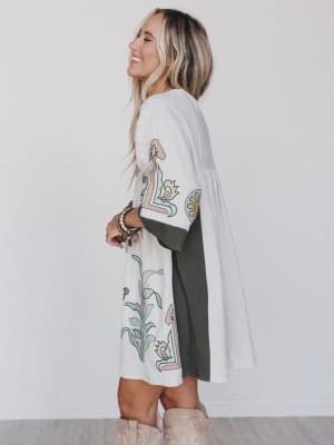 - The Chateau Chic Babydoll Tunic Dress blends easy elegance with ornate embroidery and a flattering relaxed fit
