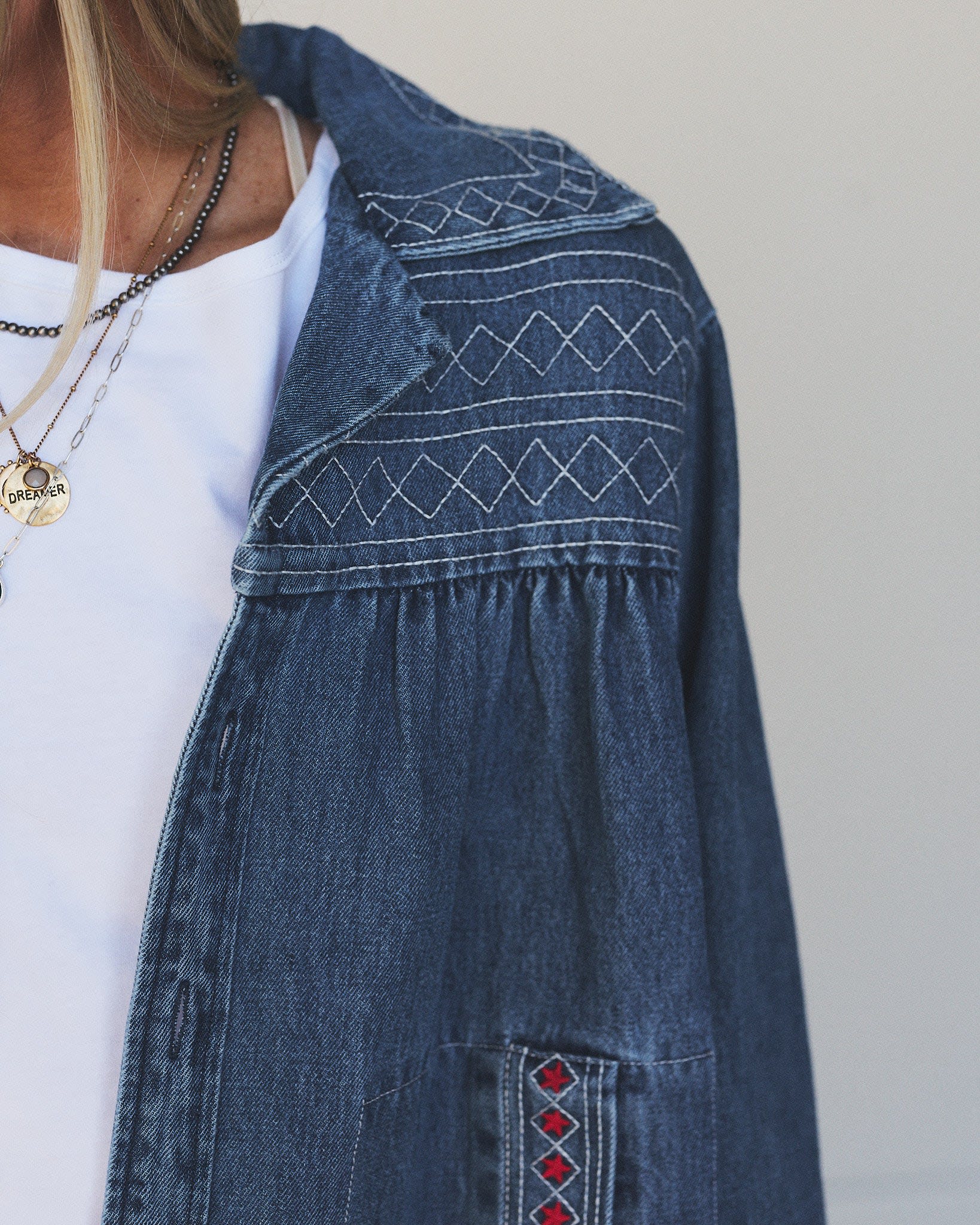 The Denim Joy Jacket is the piece you’ll keep reaching for—perfect for cool coastal mornings, outdoor markets, or breezy desert nights. Its artisan-inspired stitching brings texture and soul to every outfit.