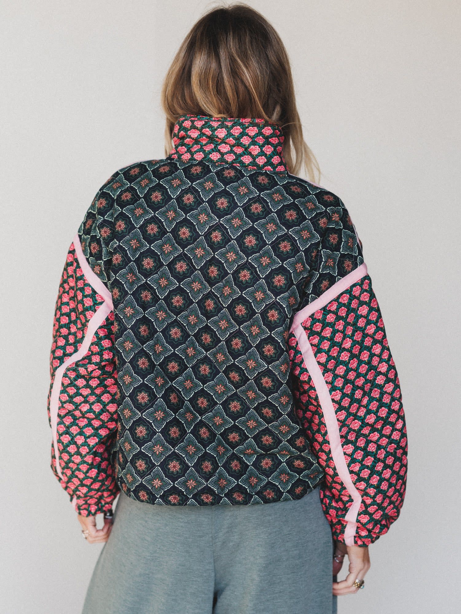 - Mix-and-match floral prints in deep jewel tones with soft pink trim