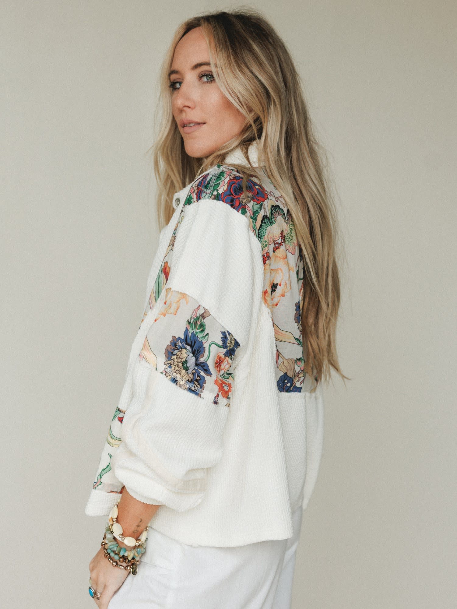 • Soft ivory textured fabric with colorful floral patchwork panels for a unique boho jacket look