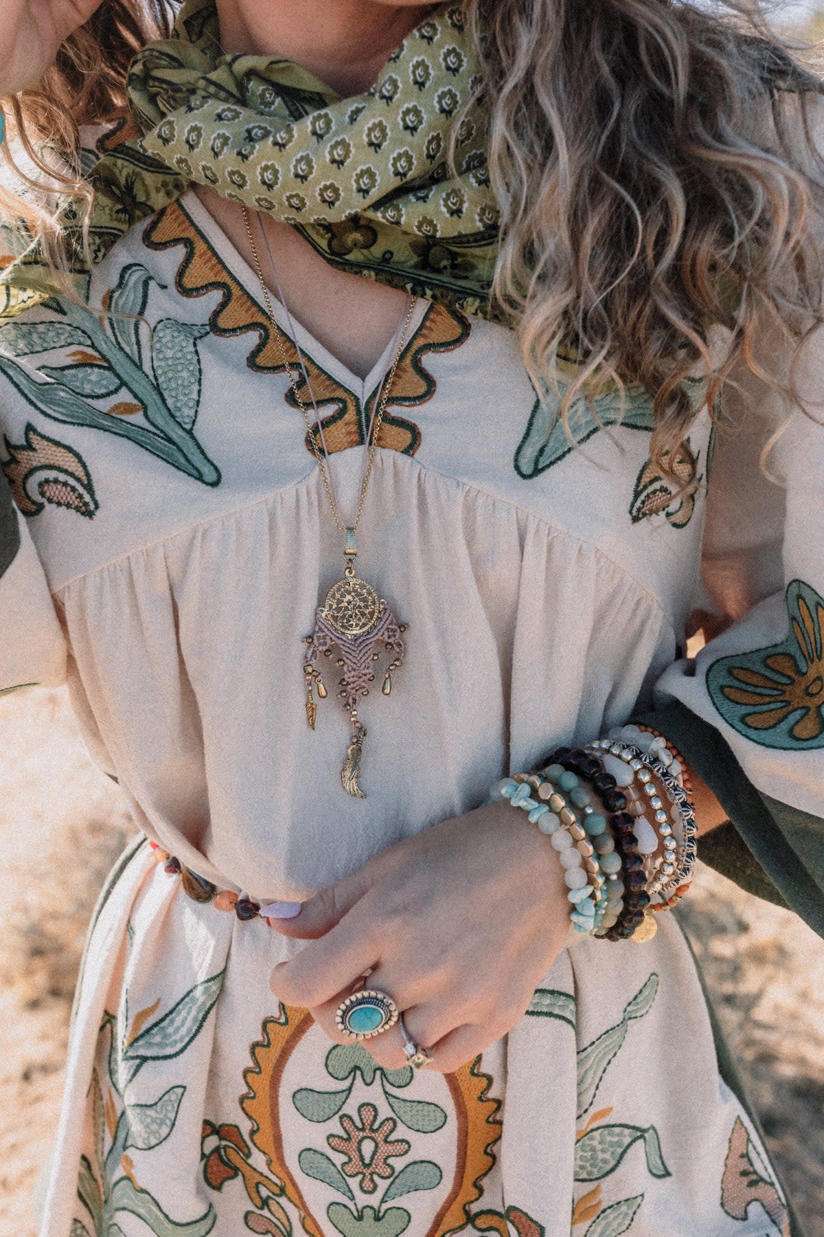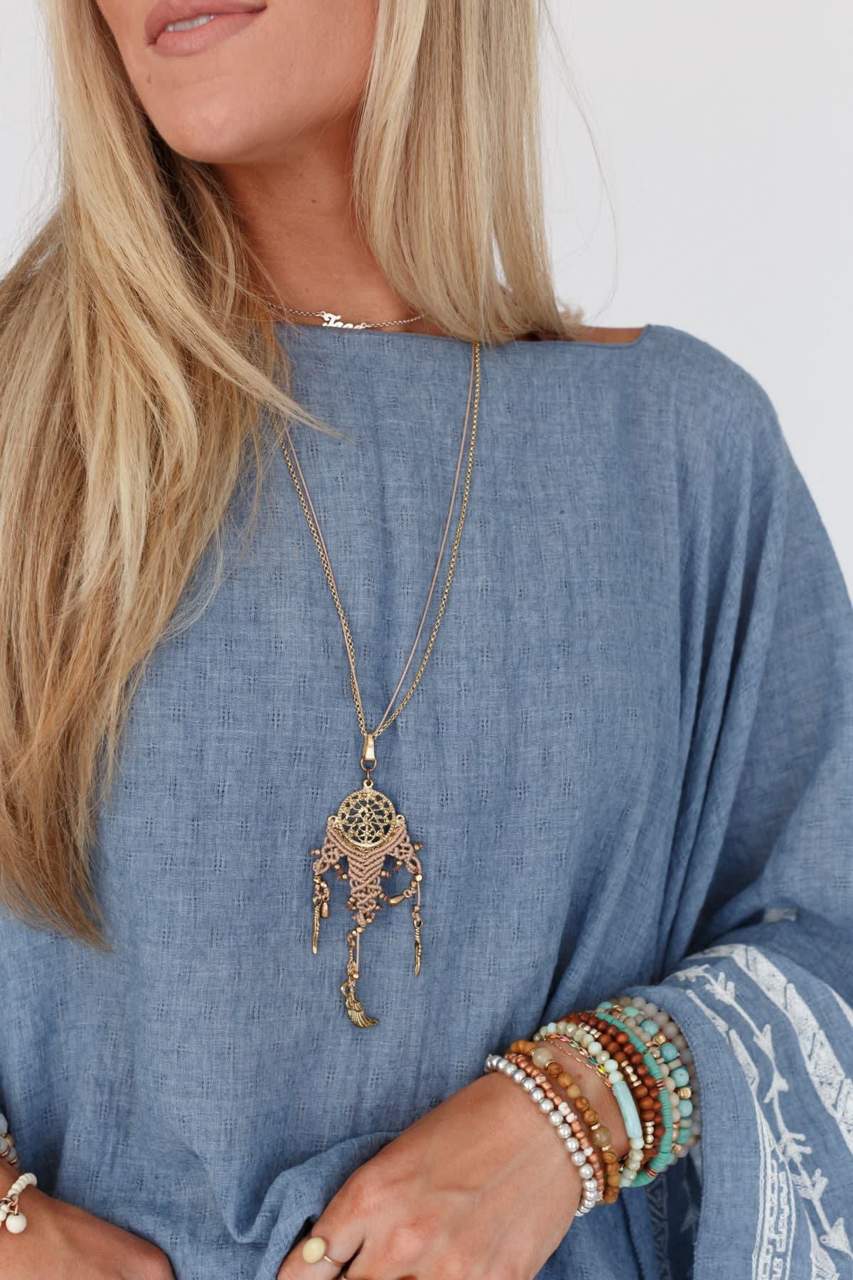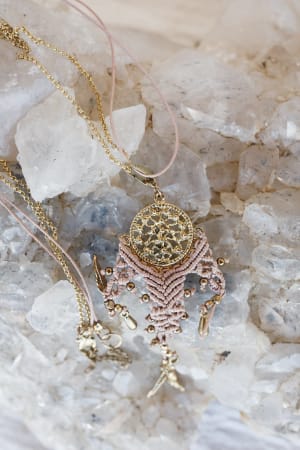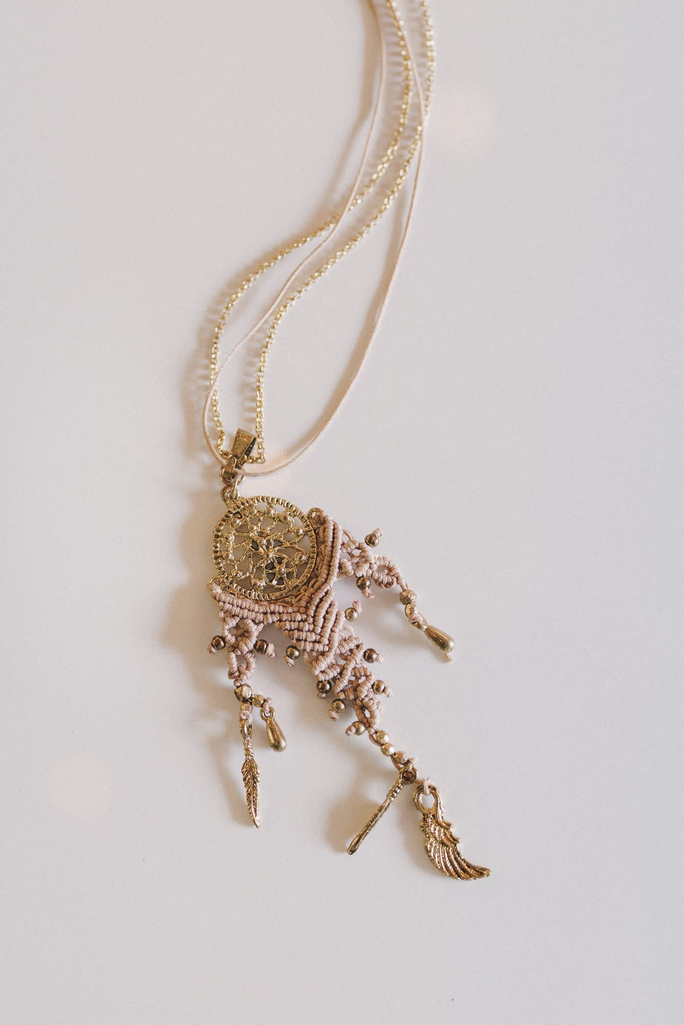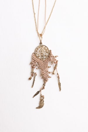 - Dreamcatcher pendant including various ropes, beads, and gold charms