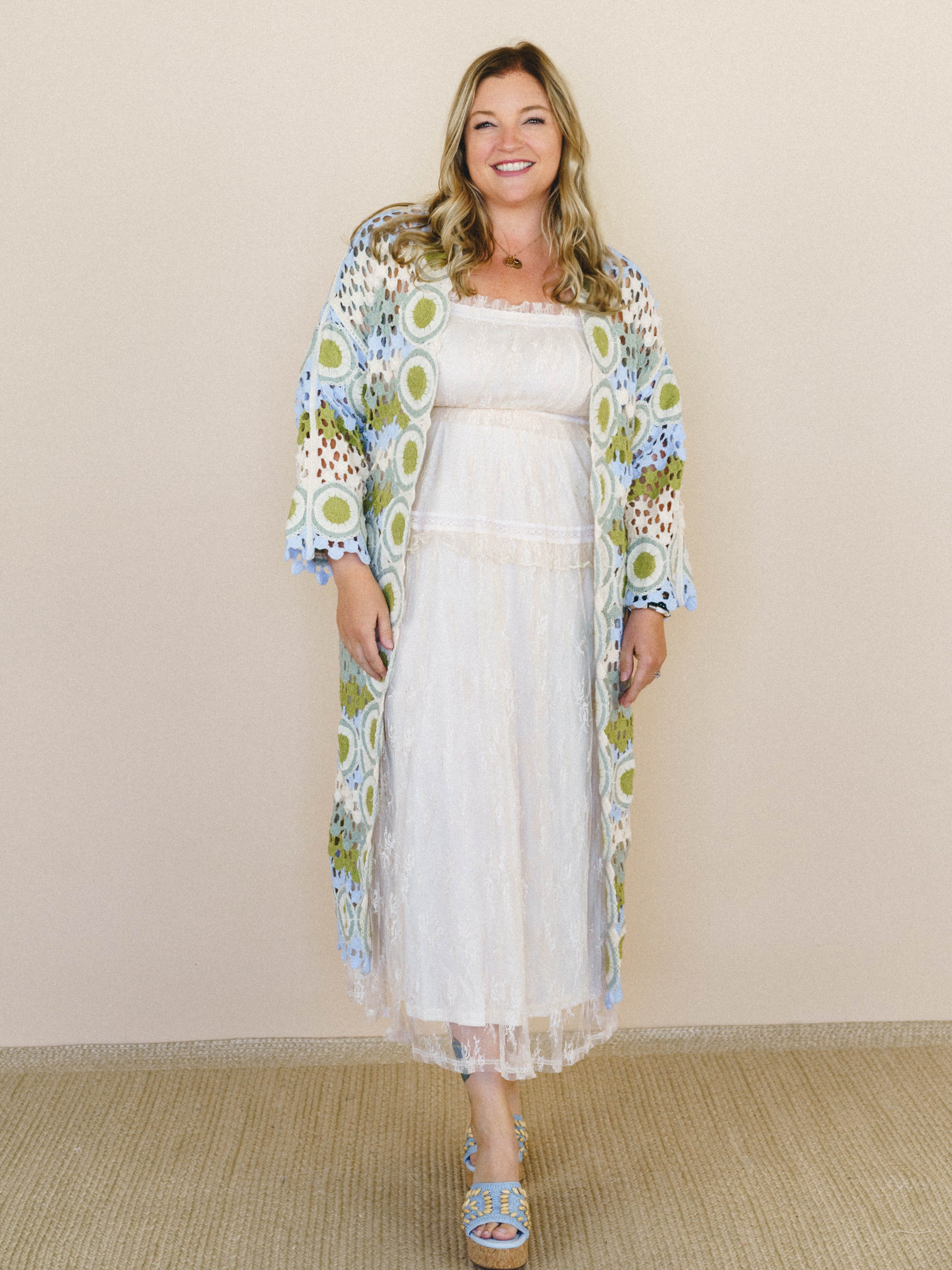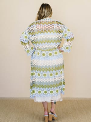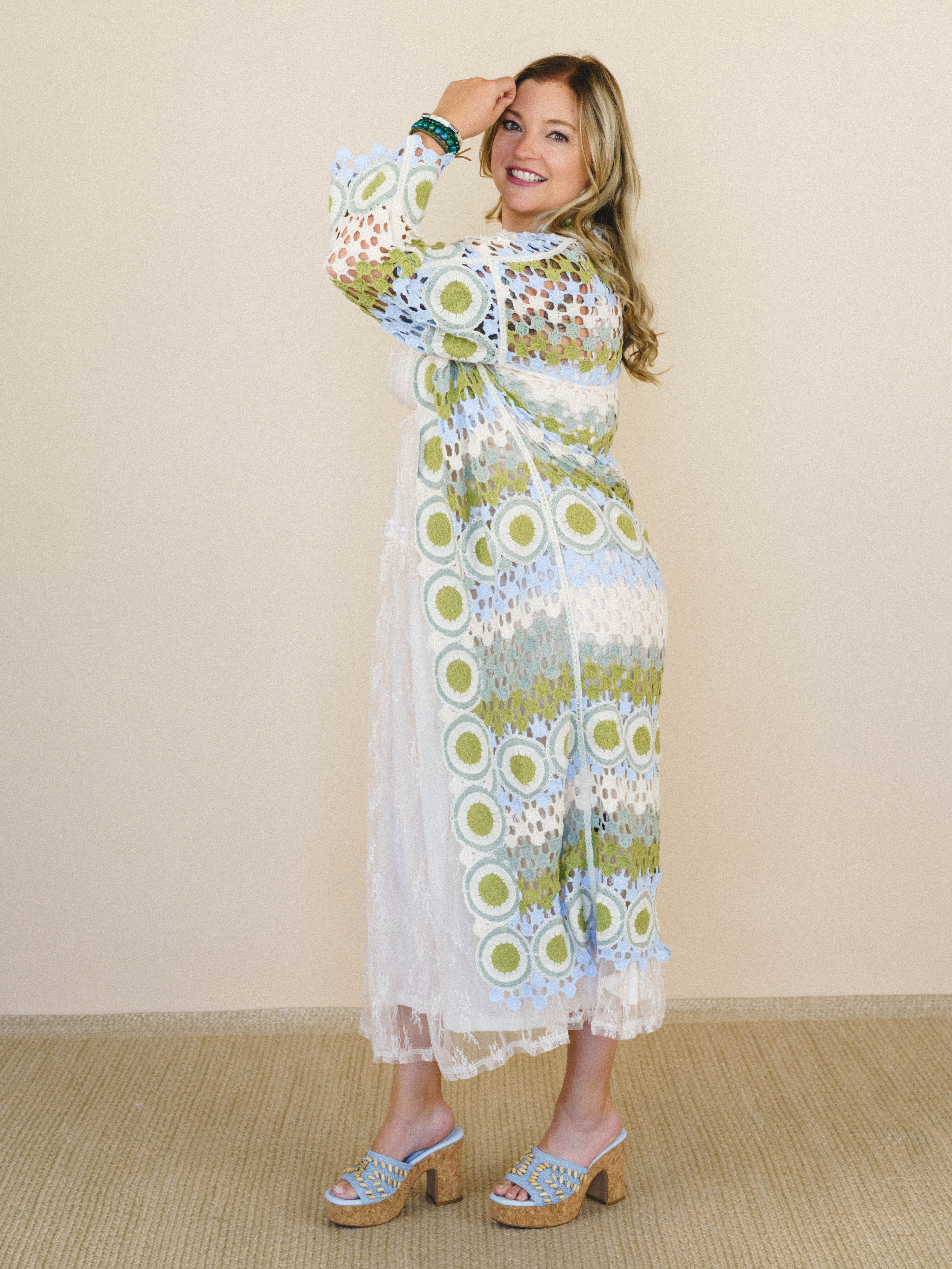 This dreamy boho cardigan is exactly what to wear on a road trip when you want effortless layers that transition from coffee stops to sunset views. The intricate circle pattern and open knit details make it a standout piece for your bohemian fashion collection.