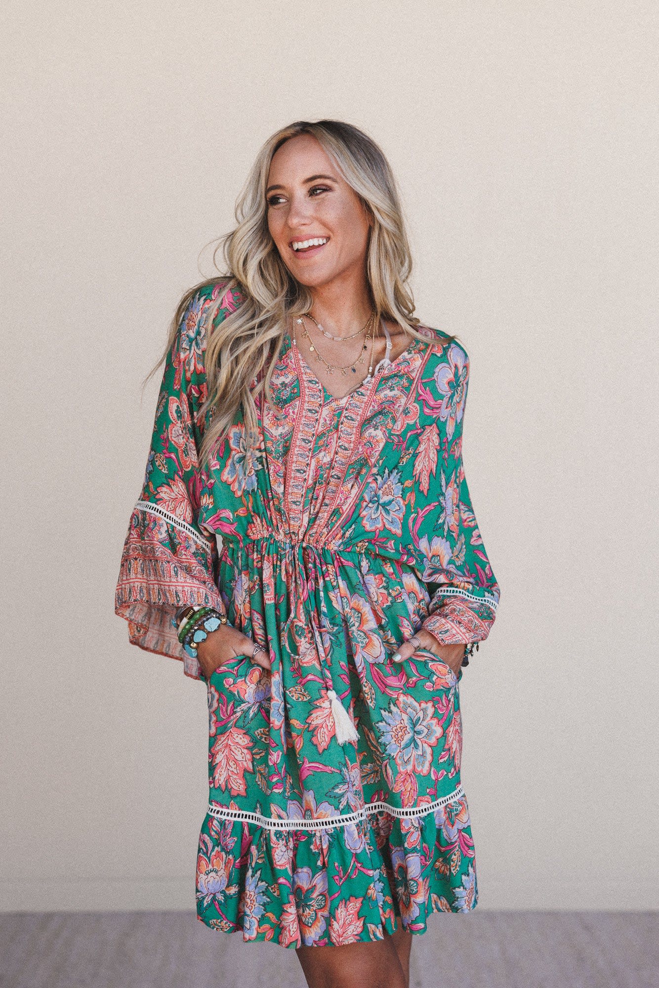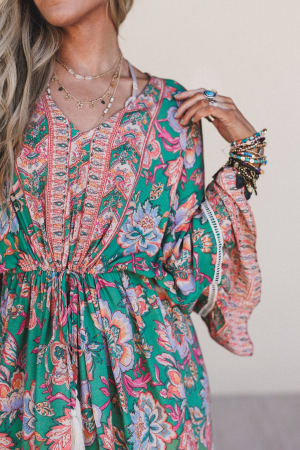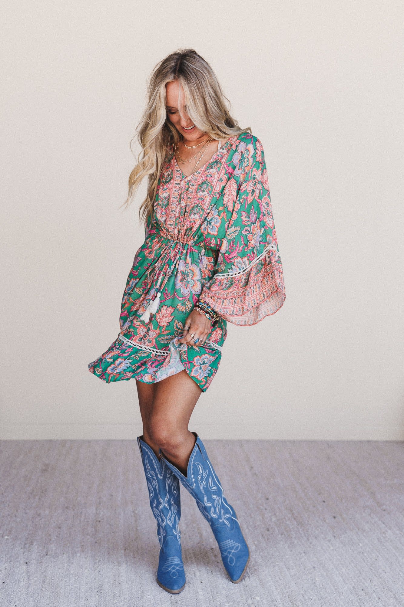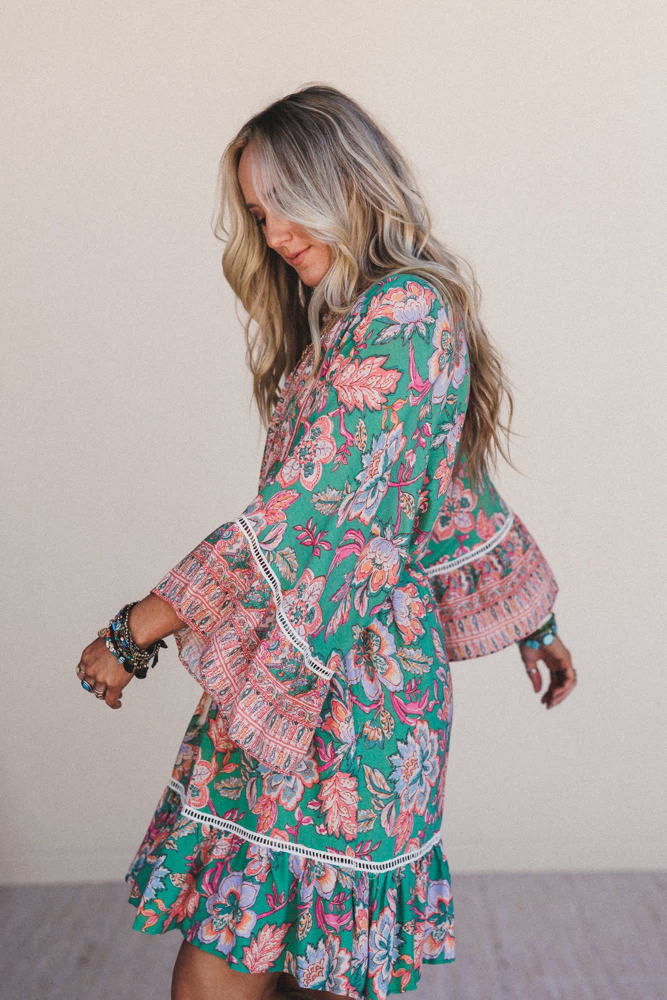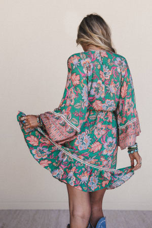 Float through your day in the Dreamy Doll Printed Dress. With its soft green tones and whimsical pattern, it’s pure boho magic.