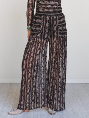 - Wide leg pants with an easy drape and all-over print that catches every step