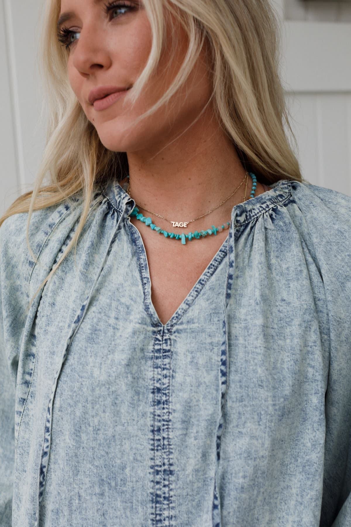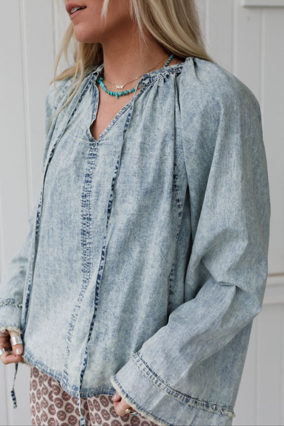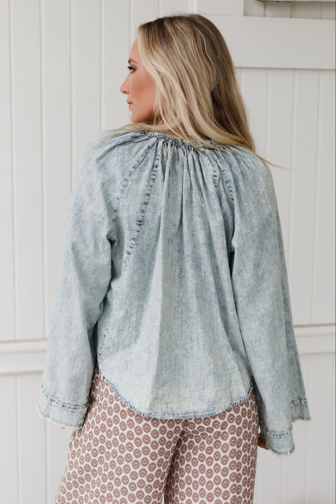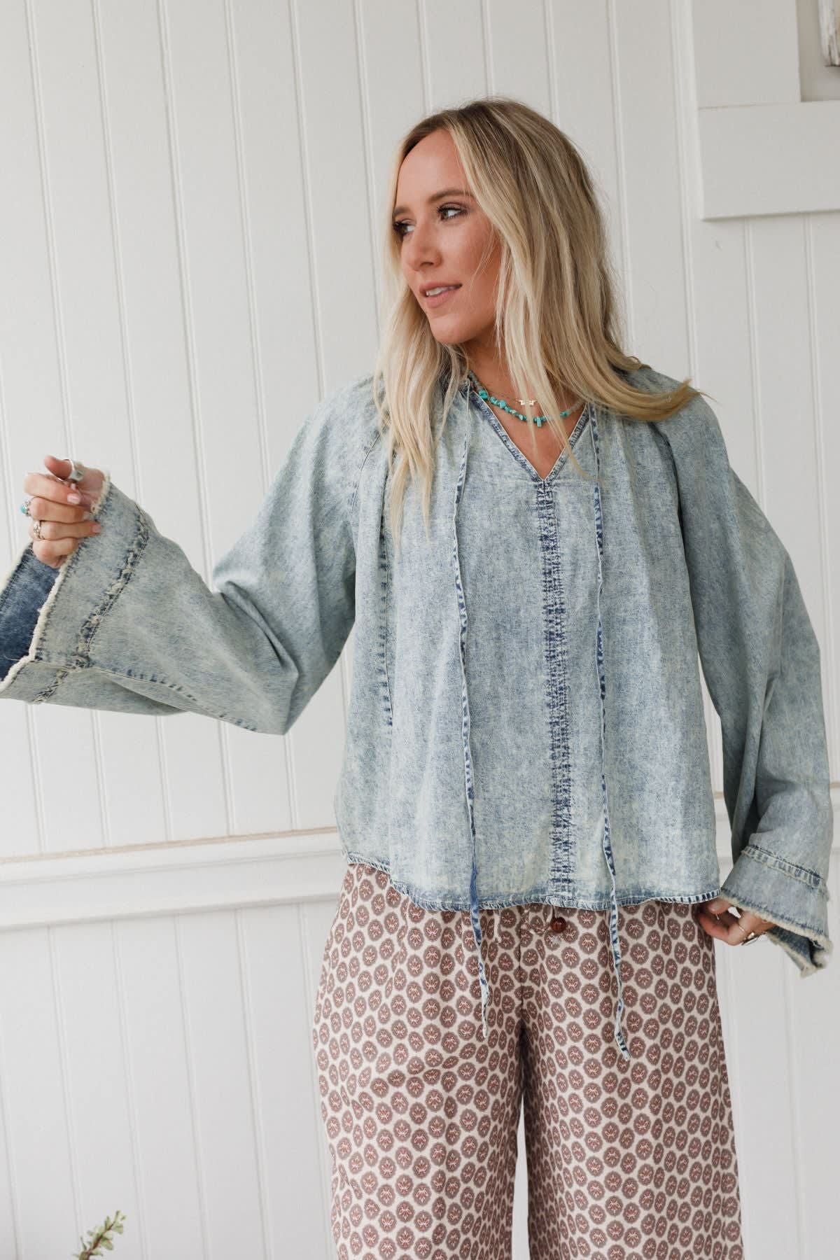 This bell long sleeve top is an instant statement maker. Pair it with a darker denim pant for depth and dimension.