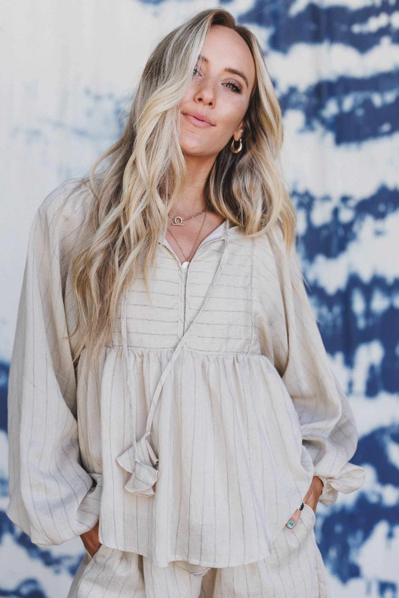 Pair this gauzy striped babydoll top with light wash denim shorts and cowboy boots to be festival ready in a snap.
