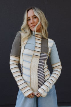 - Eclectic Stripes Top: Ribbed patchwork design in tonal browns, blues, and creams with contrast exposed seams