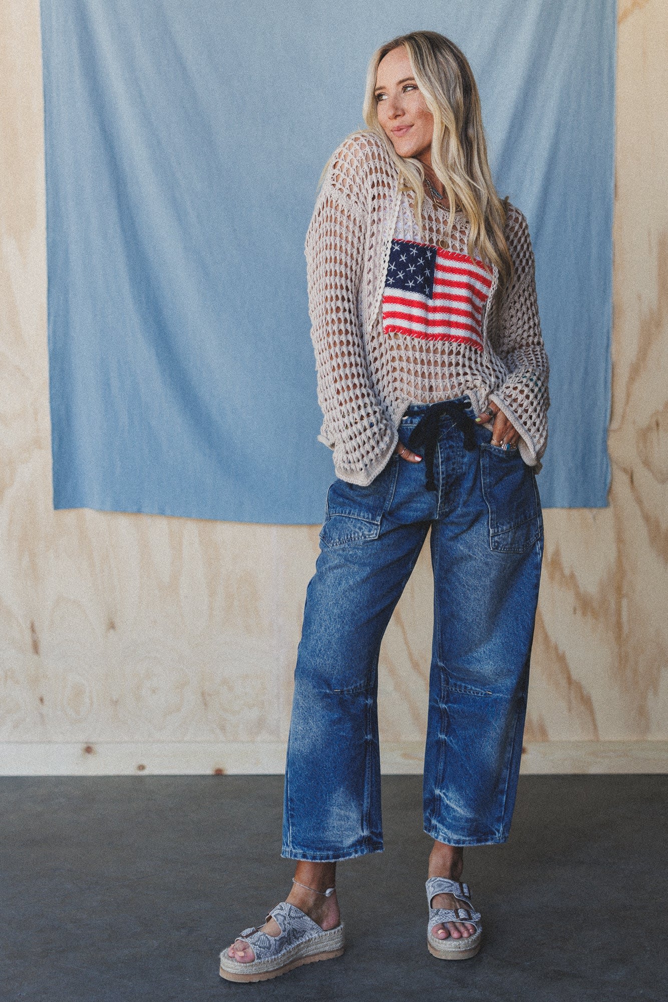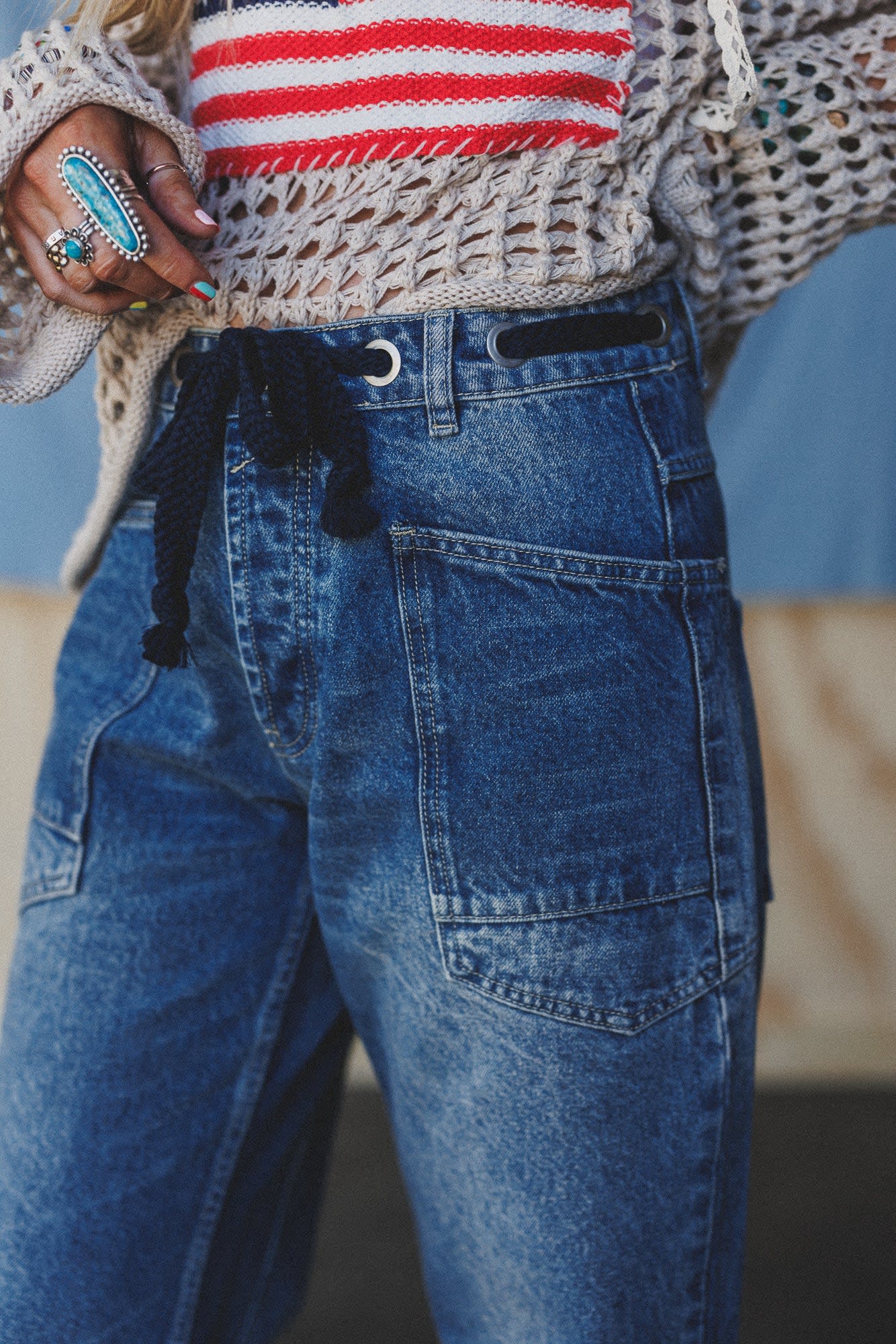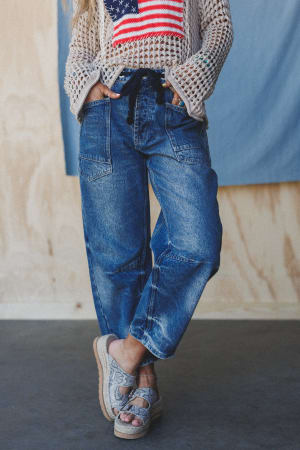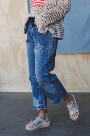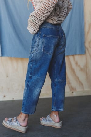 These bohemian jeans feature a unique barrel silhouette that makes them perfect to pair with chunky loafers.