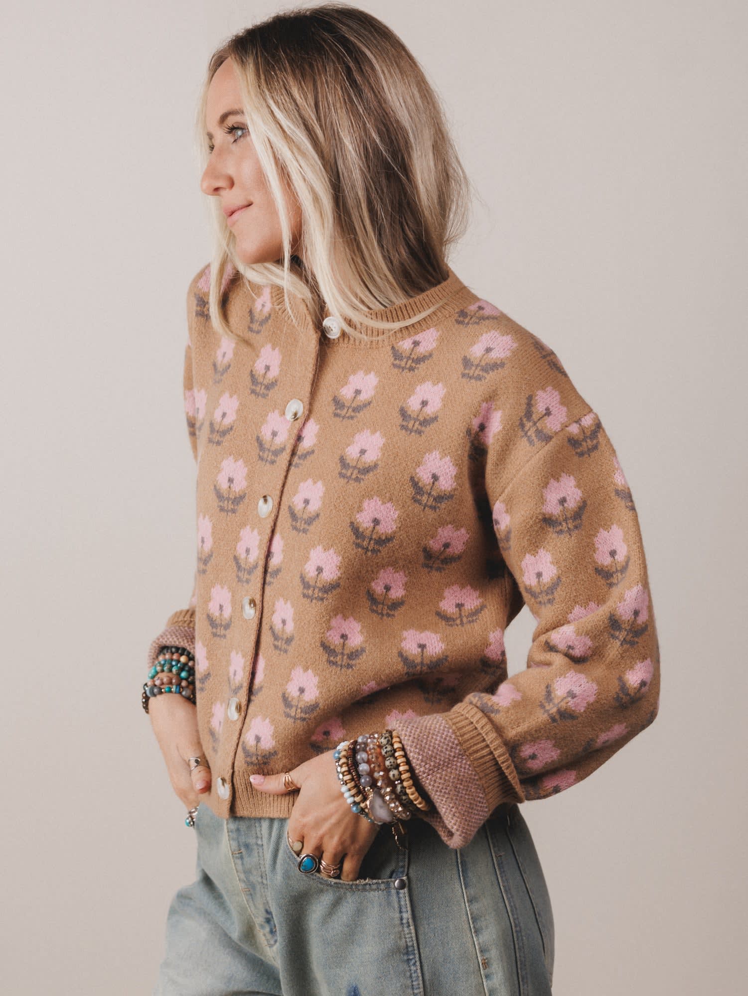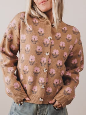 The Elodie Floral Cardigan is a cozy, vintage-inspired layer with just the right touch of sweetness. Covered in soft pink blooms and finished with charming details, it's your new go-to for effortless style and warmth.