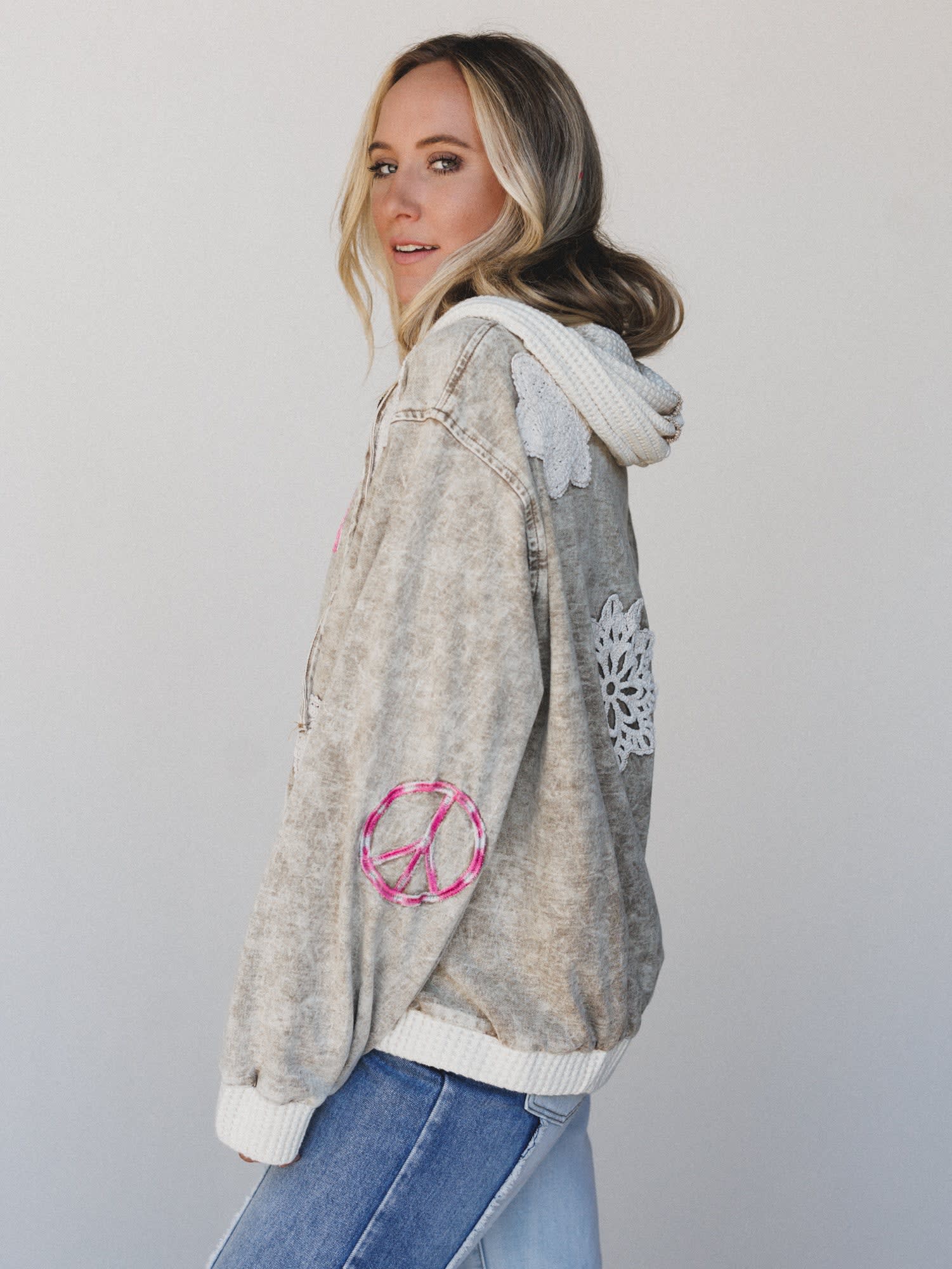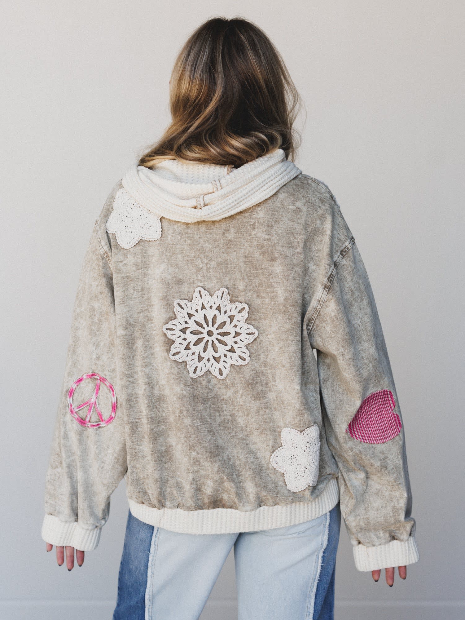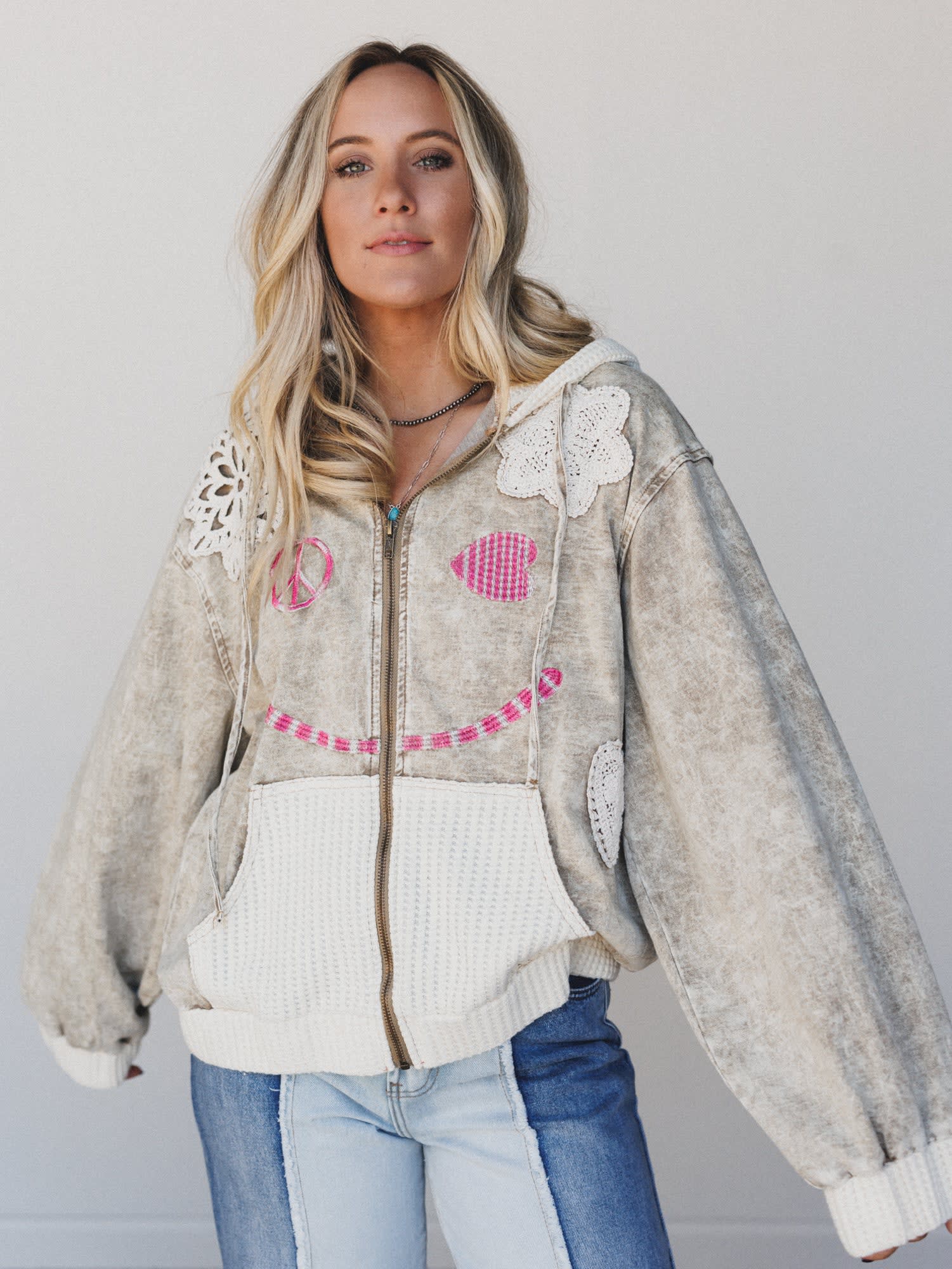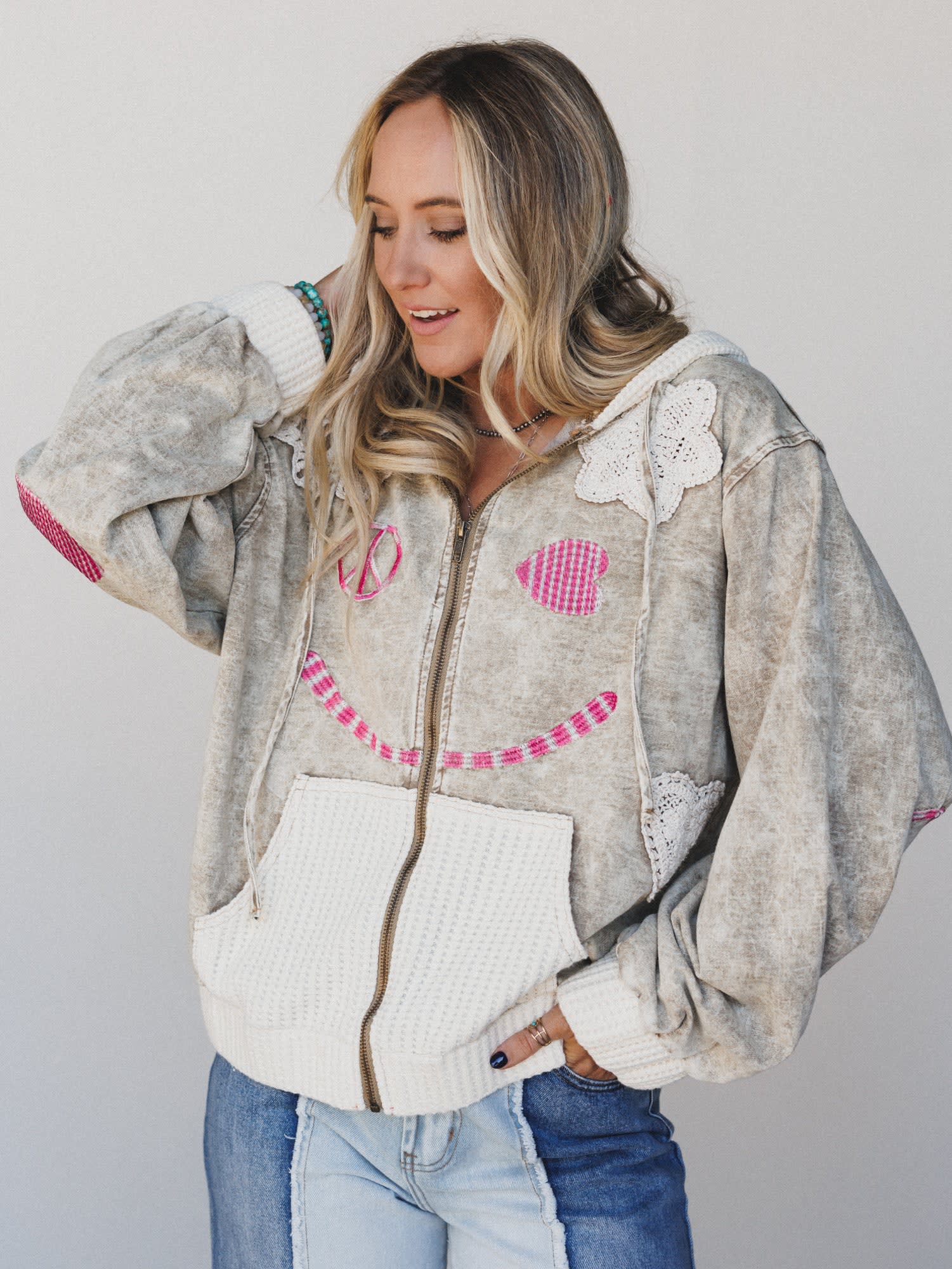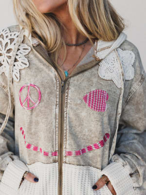 This hoodie brings feel-good vibes to every outfit — literally. With a giant smiley, patchwork hearts, and peace signs stitched in soft pinks and cozy textures, it's all about comfort and charm.