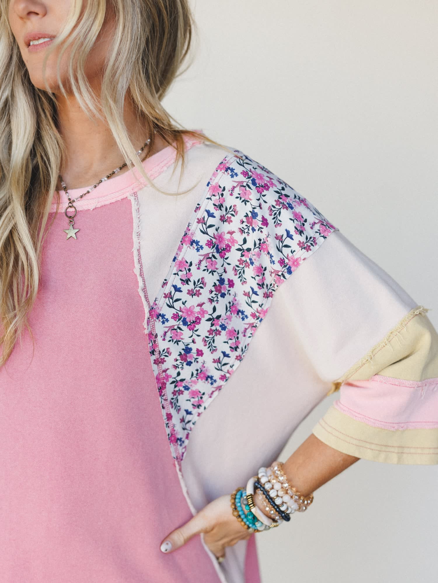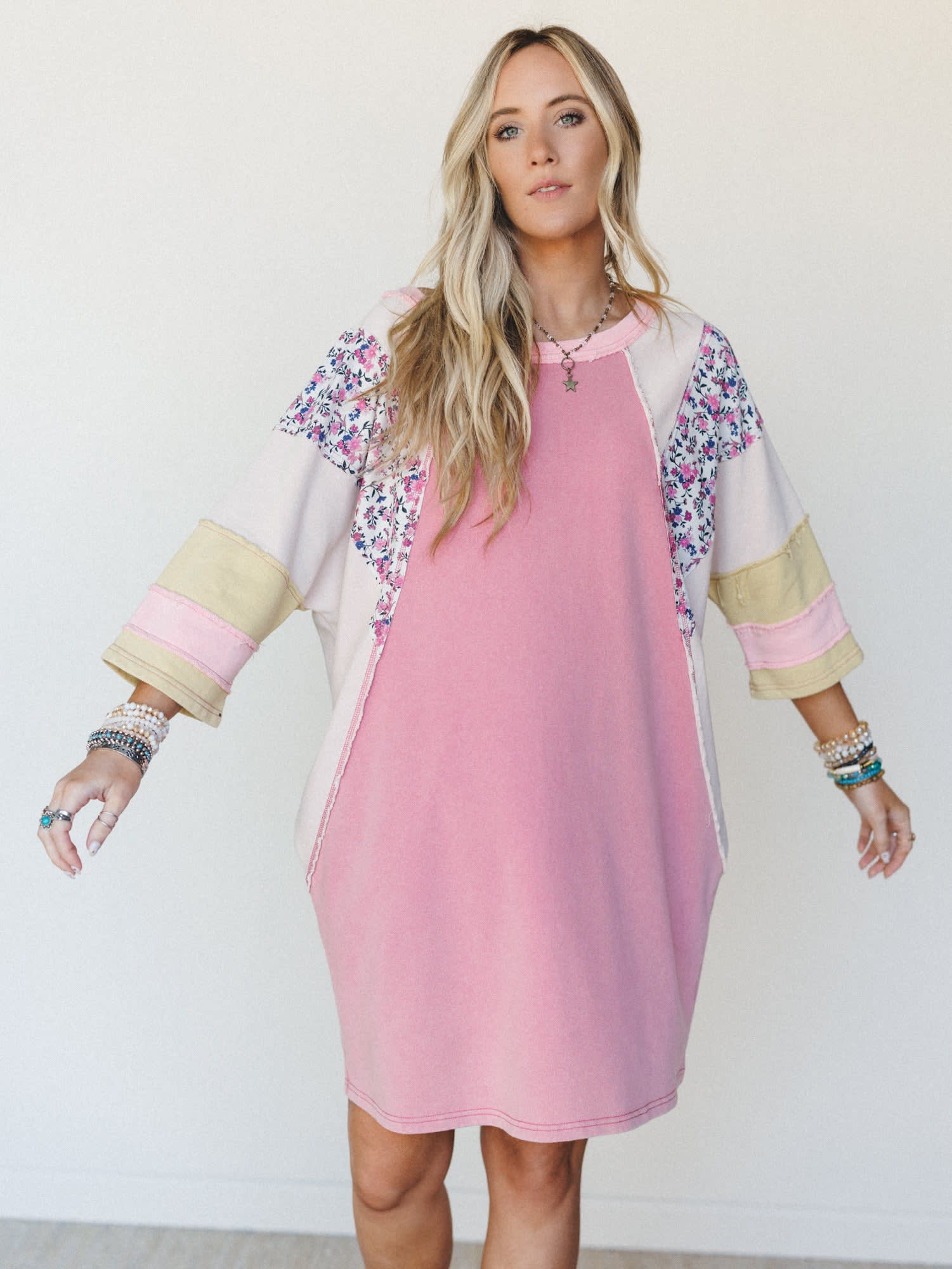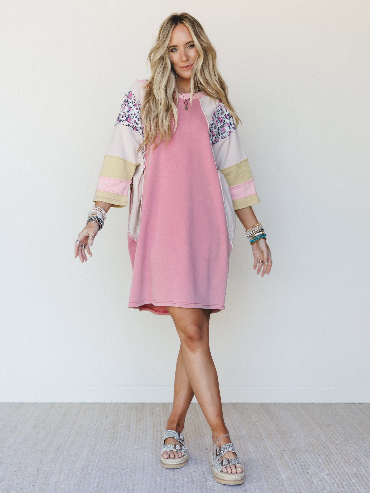 If you’re looking for what to wear on those easy, feel-good days—think errands, brunch, or lounging but still cute—this is the dress you’ll keep grabbing. The soft rosy pink with floral and pastel patchwork gives it that perfectly lived-in, playful boho vibe.