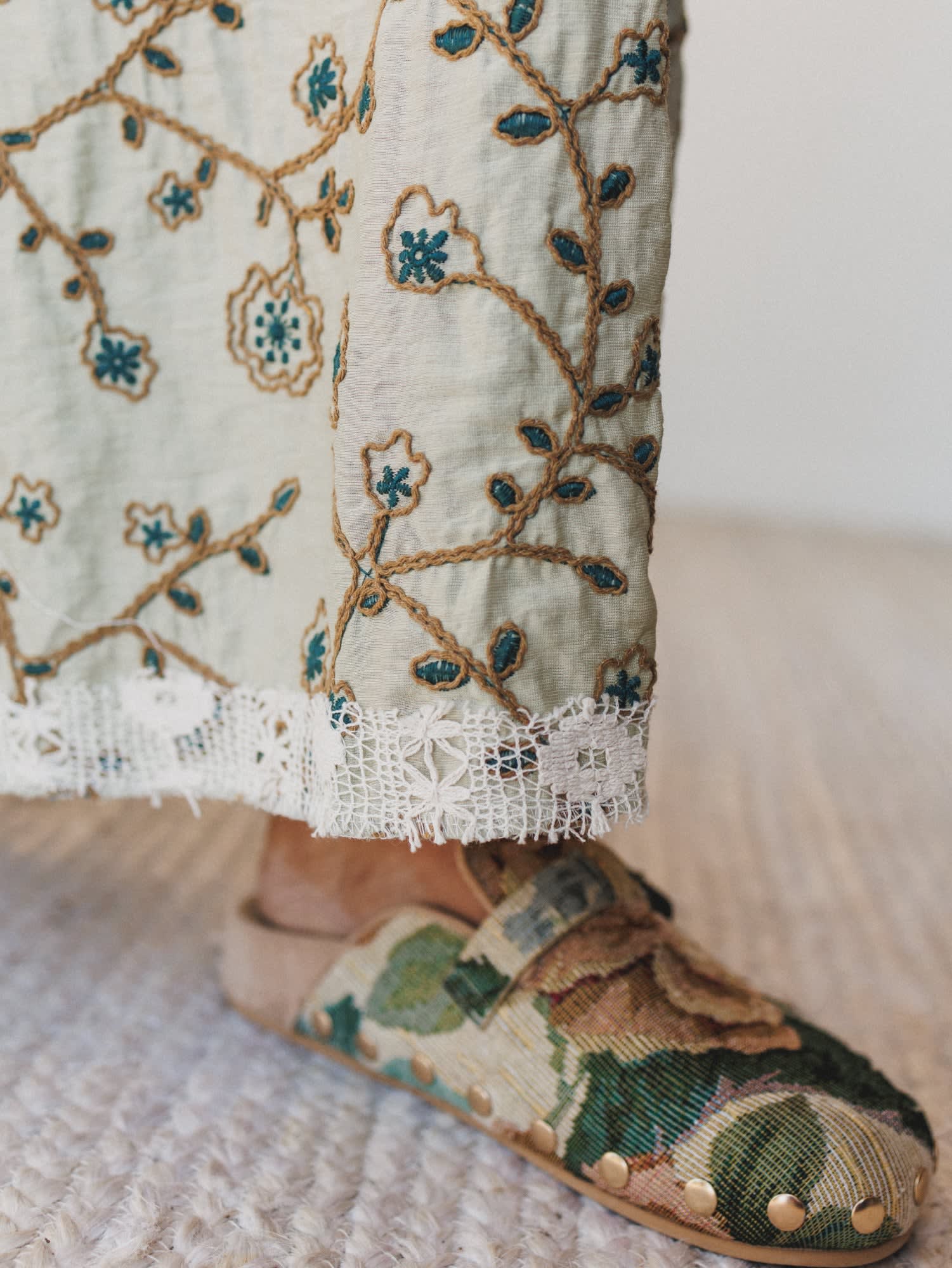 • Soft sage green base with intricate golden vine embroidery and teal floral accents