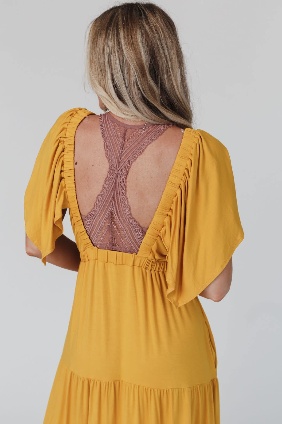 - Deep scoop neckline