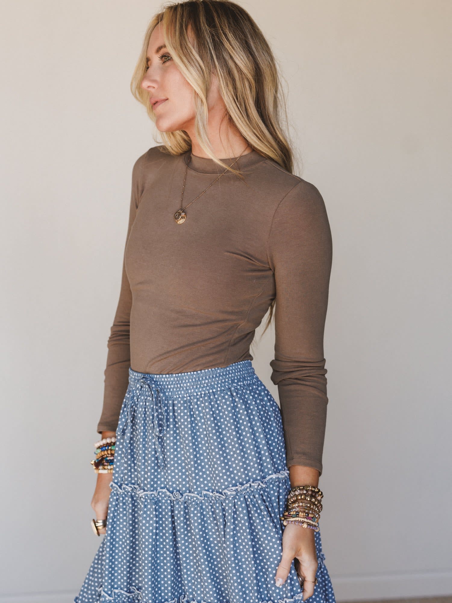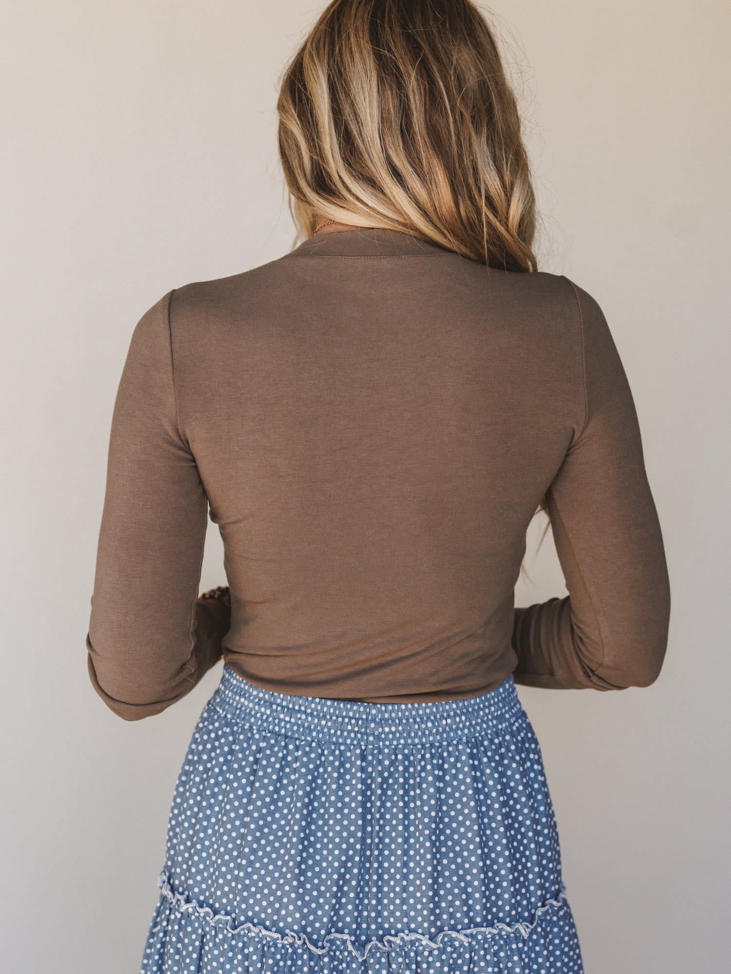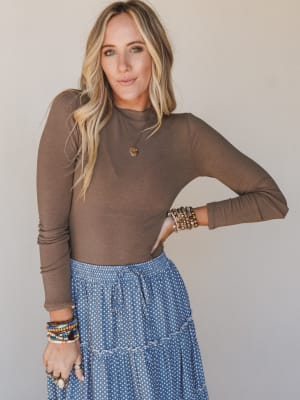 Soft fitted long sleeve top in a rich mocha brown neutral that pairs with everything