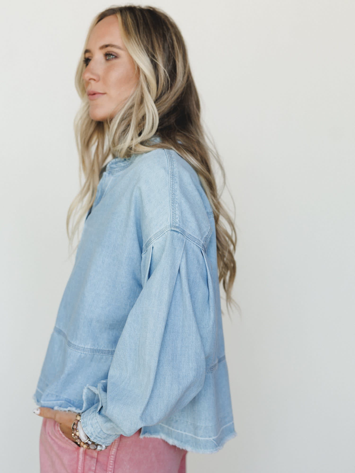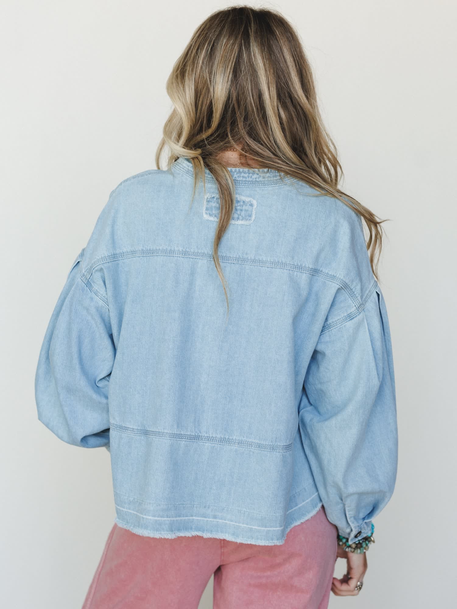 • Voluminous balloon sleeves with gathered cuffs add a feminine, fashion-forward touch that sets this apart from a basic denim shirt.