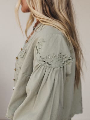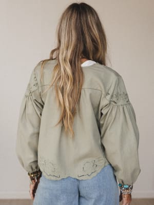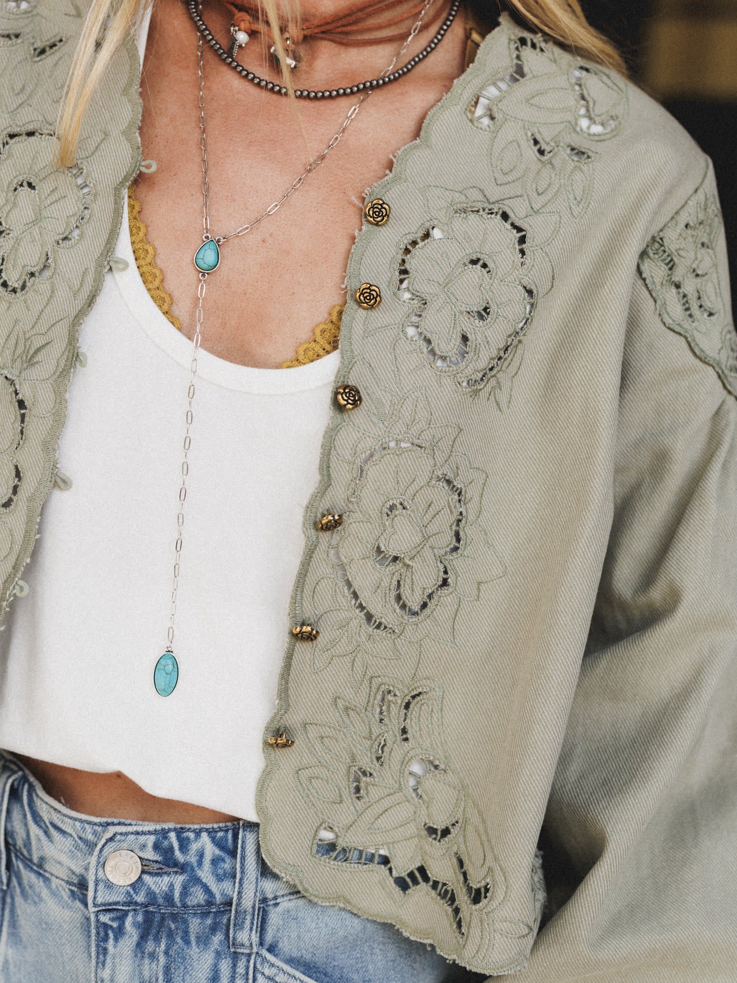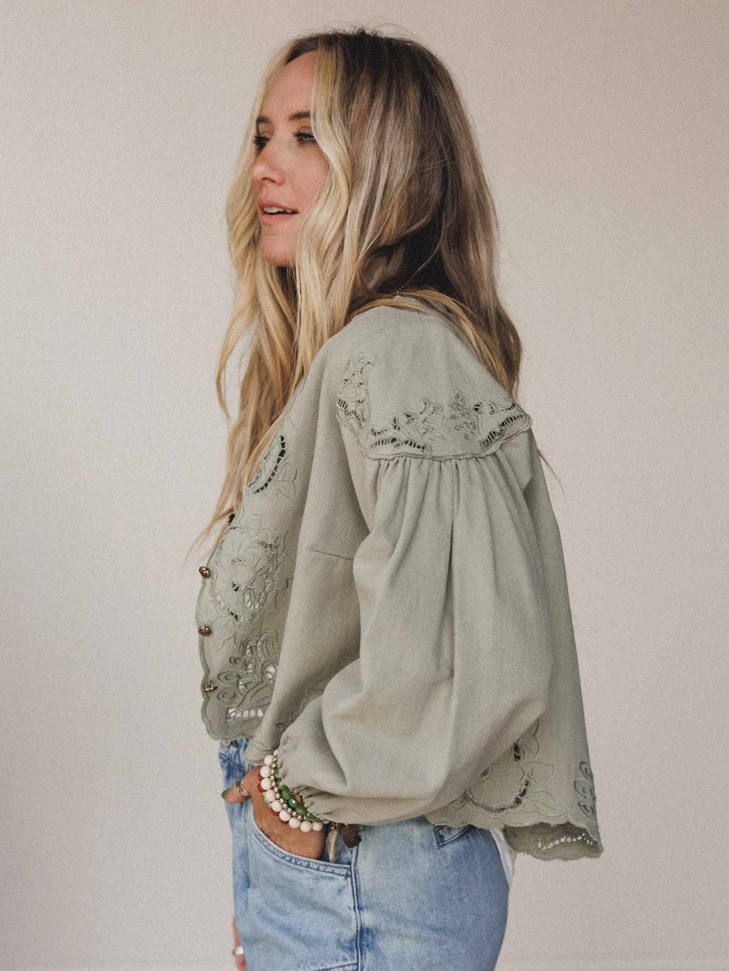 Delicate details meet everyday ease in the Extra Touch Embroidered Denim Jacket. This charming cropped layer brings a romantic feel to utility style, with soft embroidery and feminine scalloped edges that elevate your look without trying too hard.