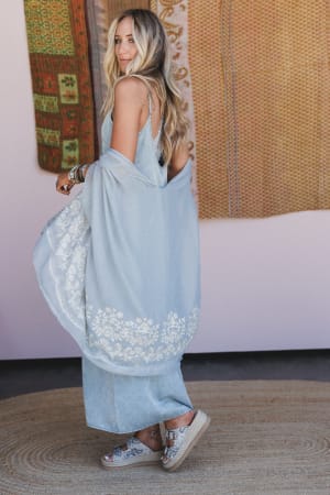 - Wild Bay Maxi Dress: A light denim maxi with a soft-washed finish and strappy neckline. Its flattering silhouette features an overlapping bodice, subtle side slit, and all-day comfort.