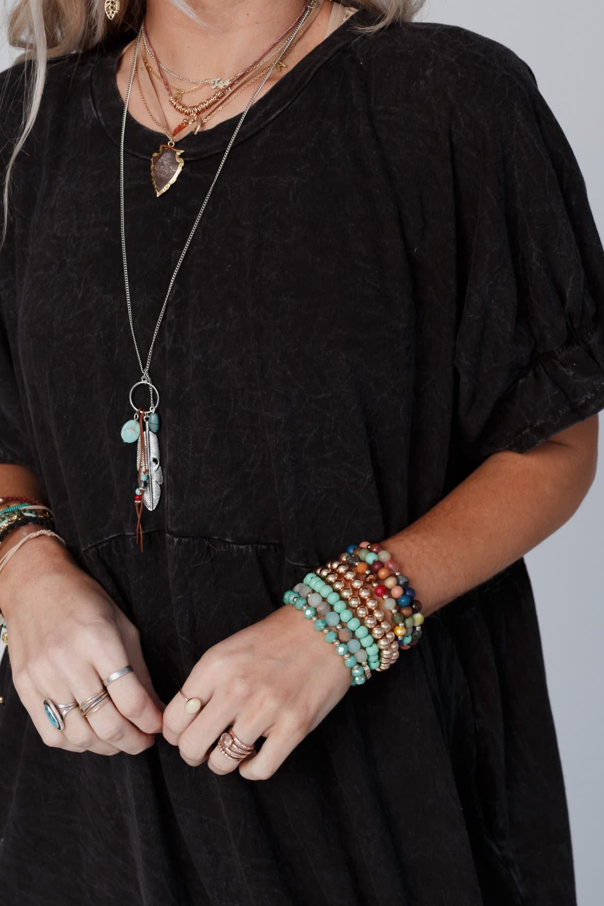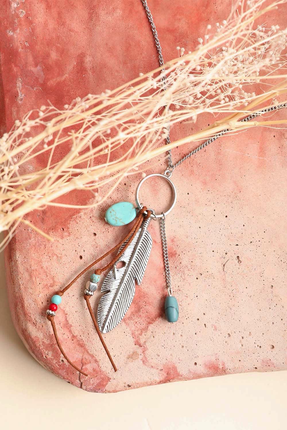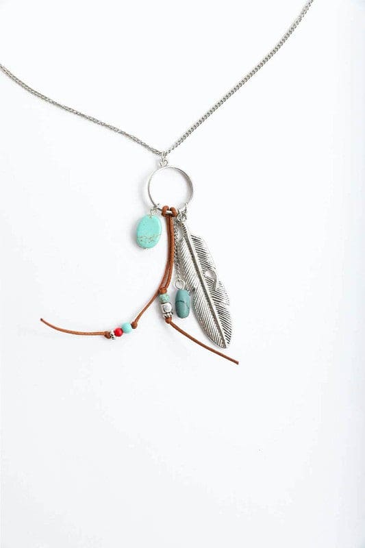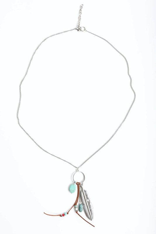 Add a boho statement to your favorite outfits with this pendant charm necklace. With a long silver chain and a pendant with attached charms including a silver feather and beads of different lengths, you can have fun layering with other accessories!