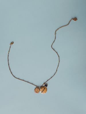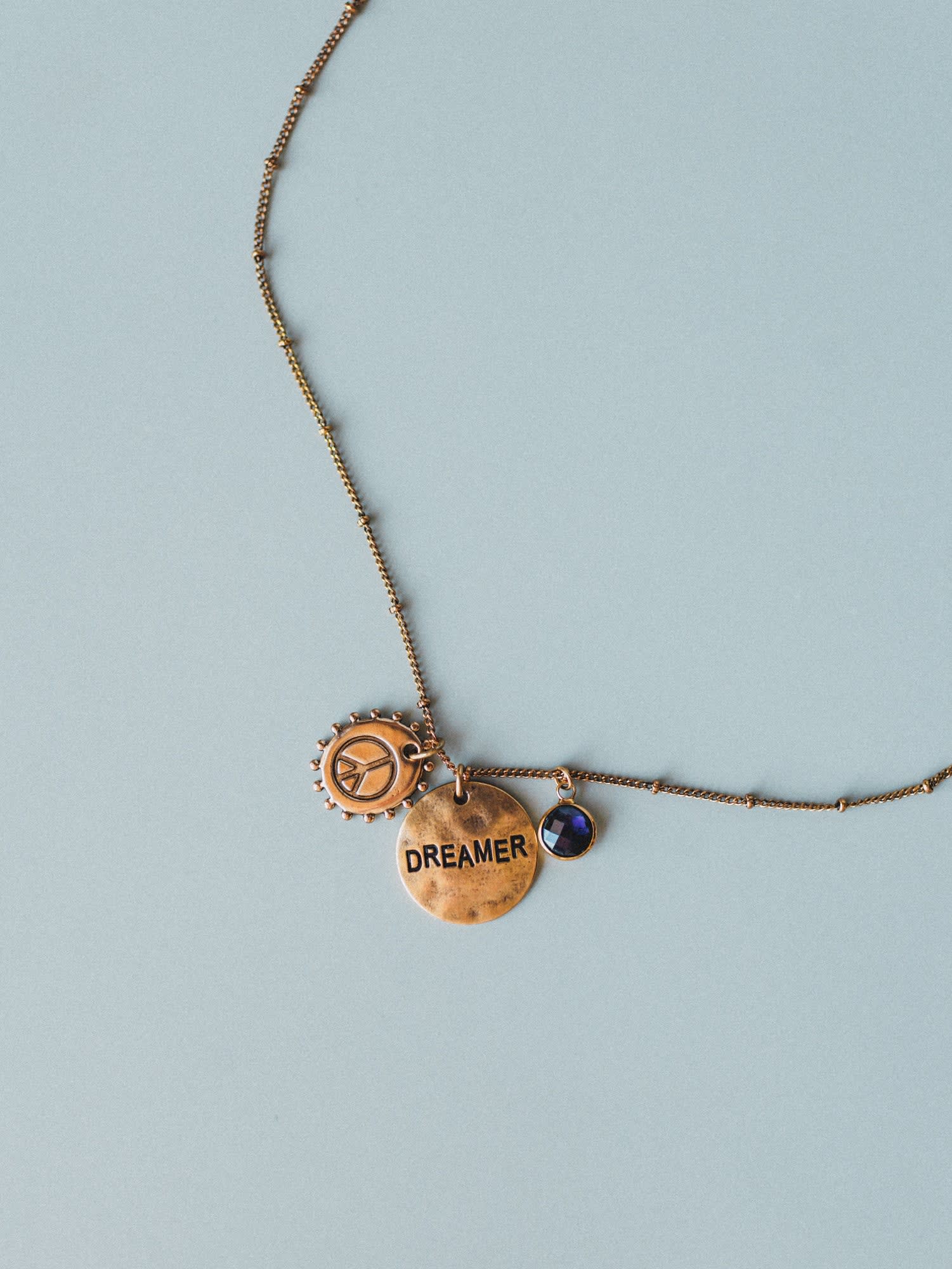 - Antique brass chain with peace and “DREAMER” charms