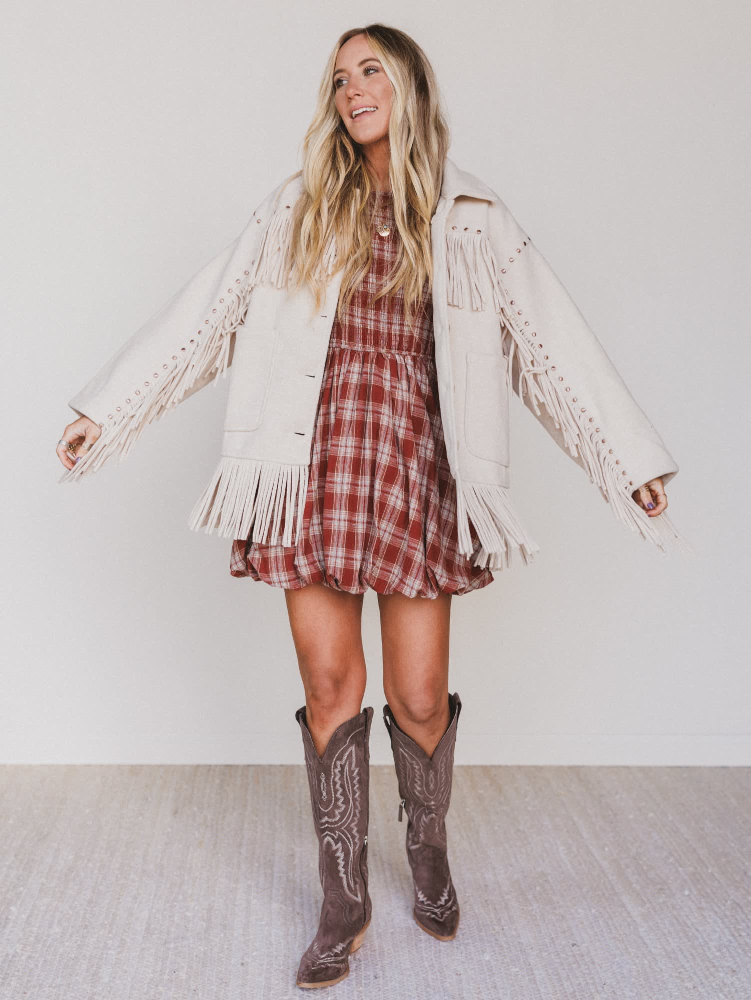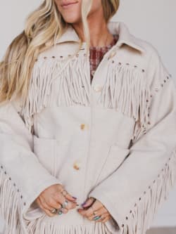 - Lolo Fringe Jacket: A cream-hued statement layer with all the fringe drama—complete with oversized buttons, brass studs, and major retro cowgirl energy