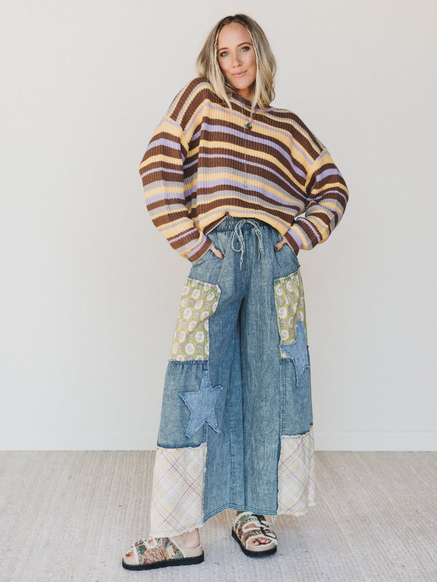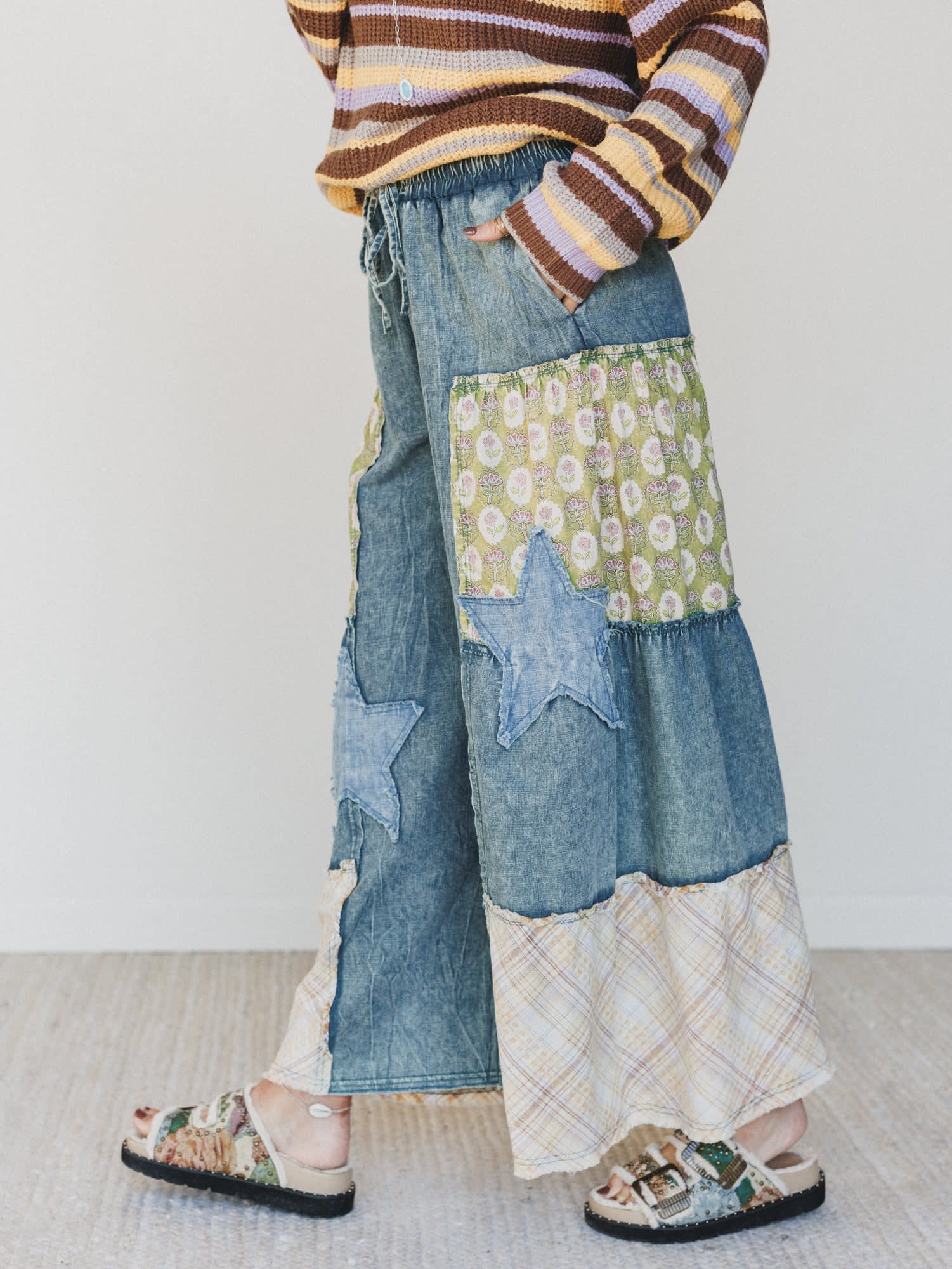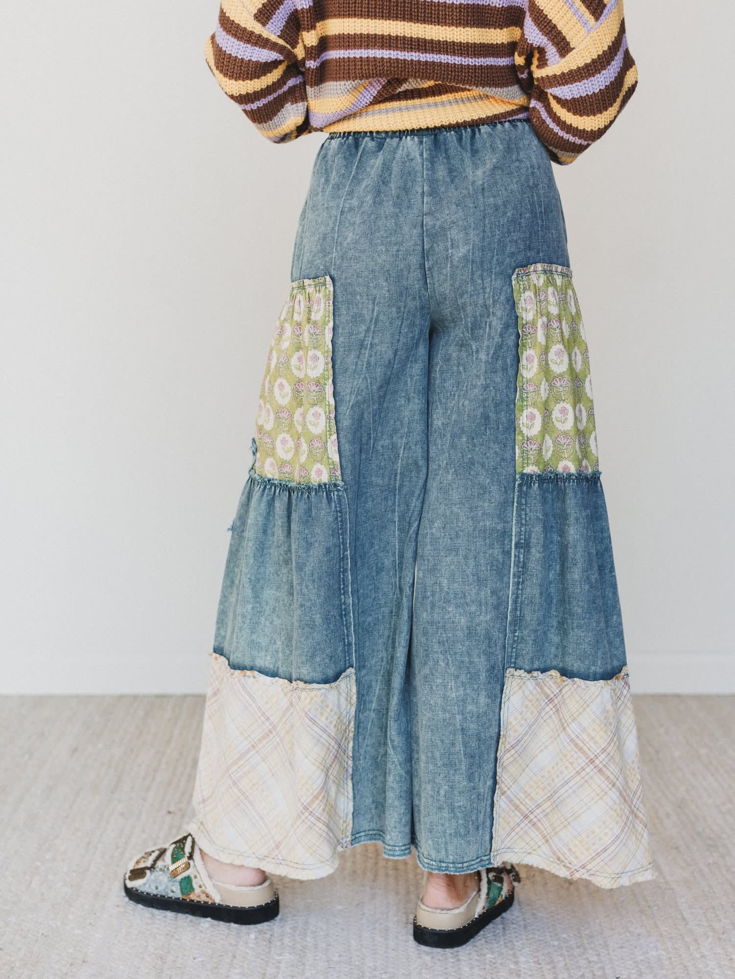 Set your inner wildflower loose with the Fields Of Free Pants. A patchwork dream in denim, floral, and plaid, these wide-leg wonders bring carefree charm and artsy flair to your fall lineup. They're what you'd wear to a roadside vintage market, a jam session in the woods, or just because you're feelin’ funky.