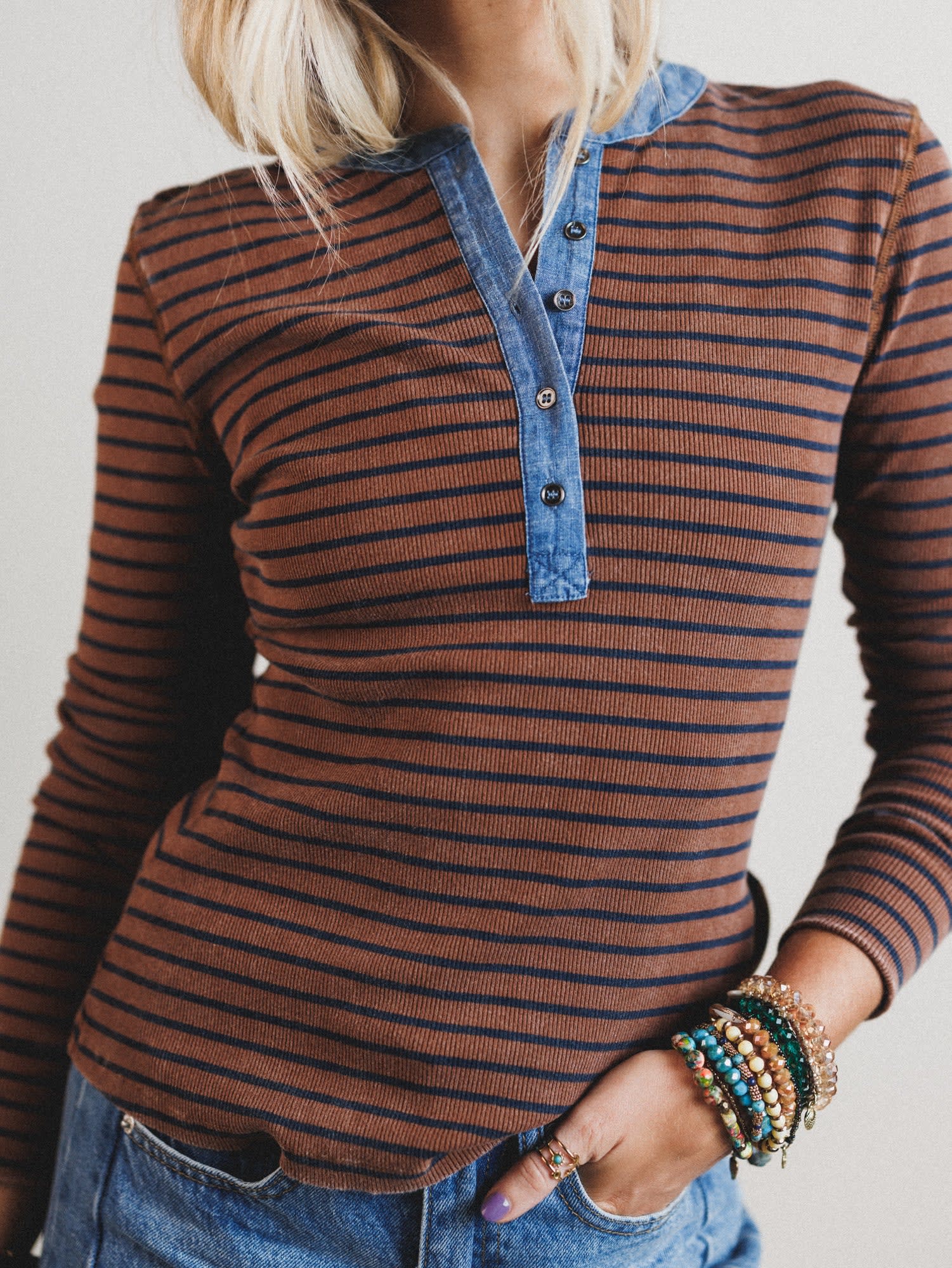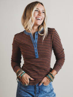 - Fieldtrip Stripe Top: This retro ribbed henley brings major ‘90s vibes with a denim trim neckline and warm-toned stripes.