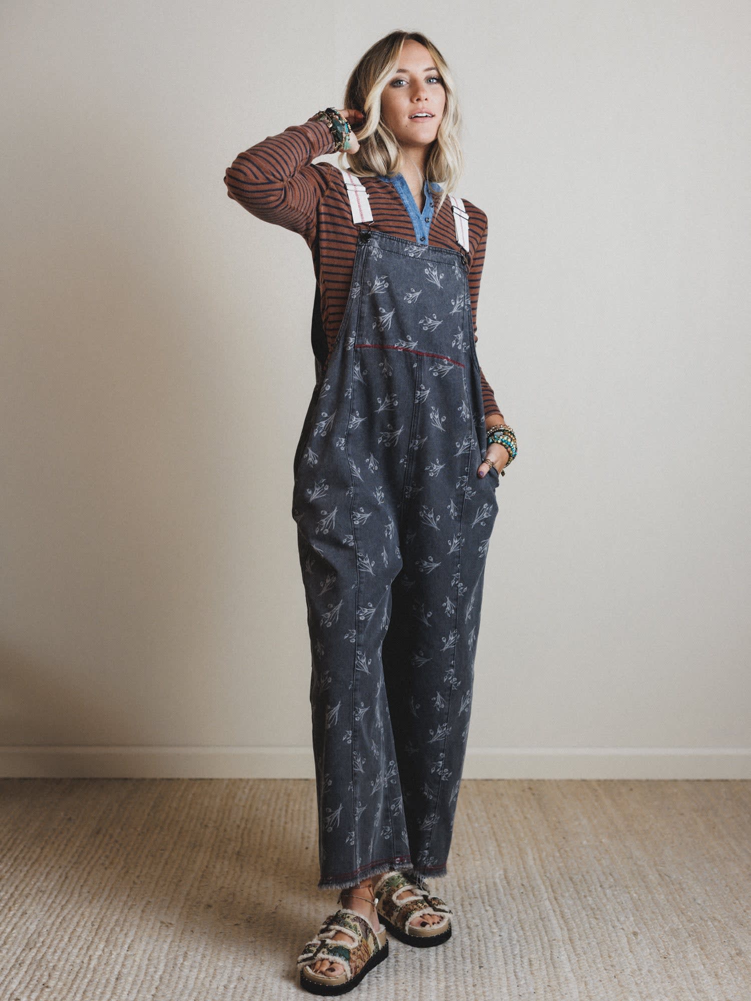 - Floral Frenzy Jumpsuit: With an overall-style fit, faded floral print, and contrast stitching, this wide-leg jumpsuit is equal parts artsy and easygoing.