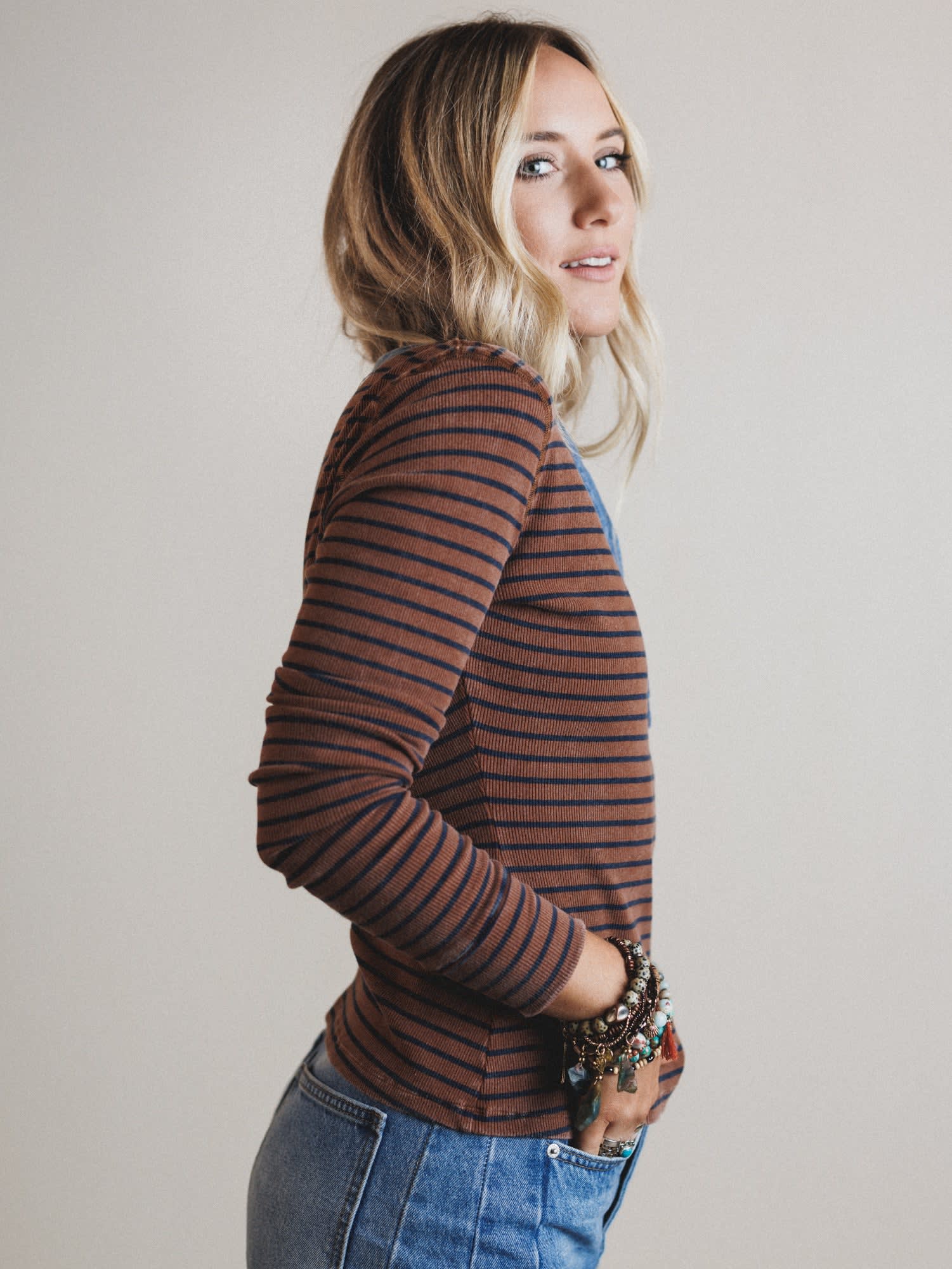 • Rich cinnamon and navy stripes for a bold, yet wearable palette